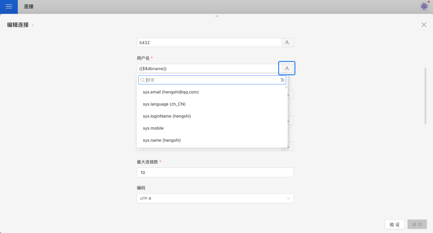 点击连接属性字段右边的用户属性图标,会弹出用户属性列表,搜索并点击所需的用户属性,用户属性就会自动填充到文本框中。