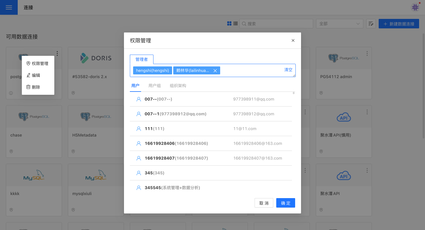 数据连接创建者(下文称 owner)创建数据连接后,可以设置连接管理员,让管理者进行数据的进一步下发。