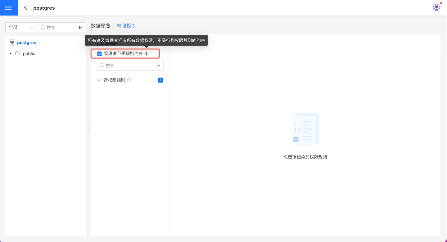 在数据连接选择需要授权的表,打开右侧的权限控制列表,点击+添加,一条空规则添加成功,修改规则的名称使其更贴合业务逻辑。