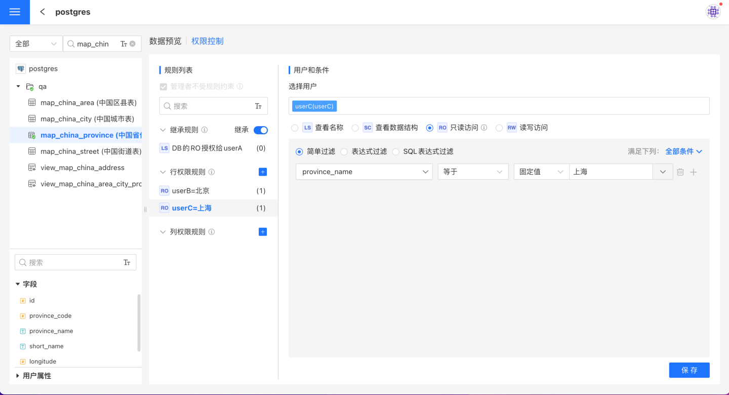 - 示例:对于同一个表,如果在规则1中为用户 A 授权访问区域为“北京市”的数据,在规则2中为用户 A 授权访问区域为“上海市”的数据,最终用户 A 可以访问的是“北京市”和“上海市”的数据。