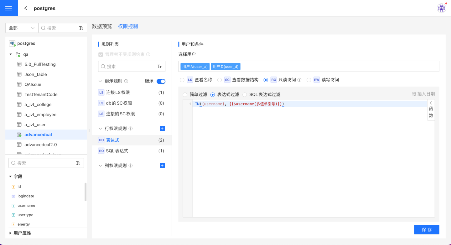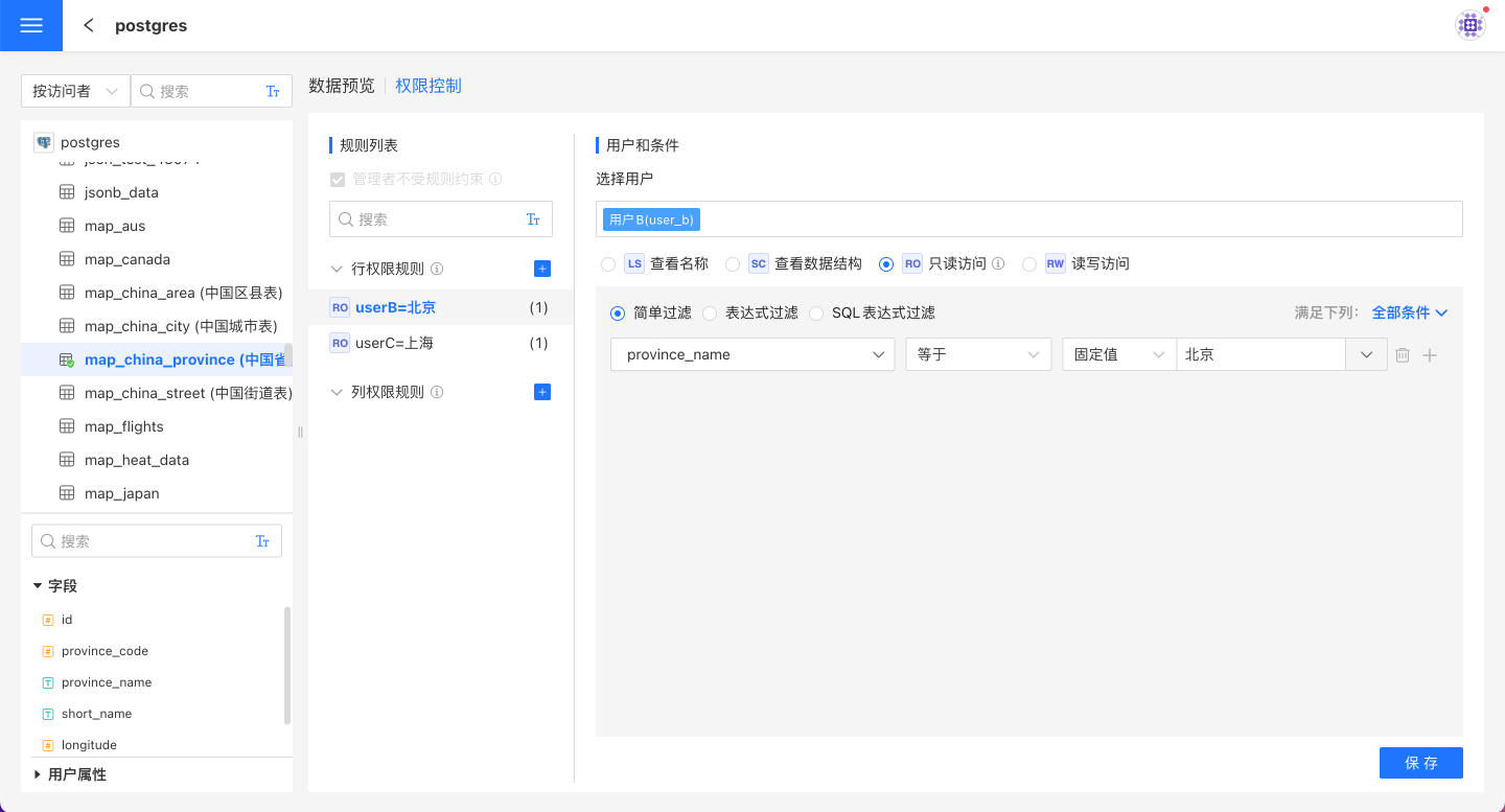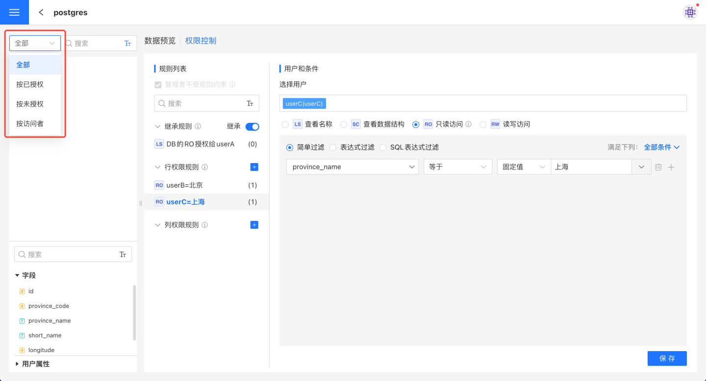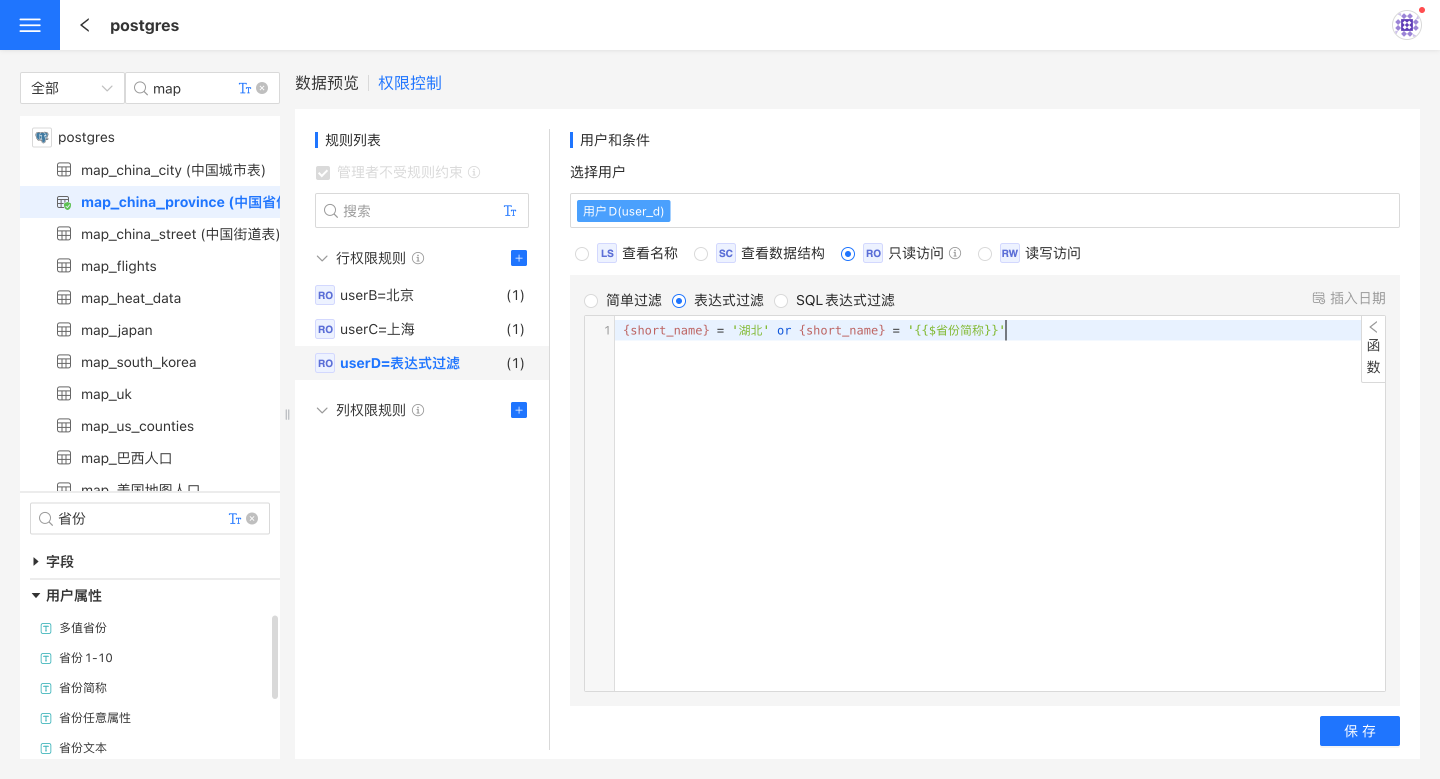 行权限设置时可通过简单过滤、表达式过滤、SQL 表达式过滤三种方法进行数据筛选,并指定用户查看筛选的数据。