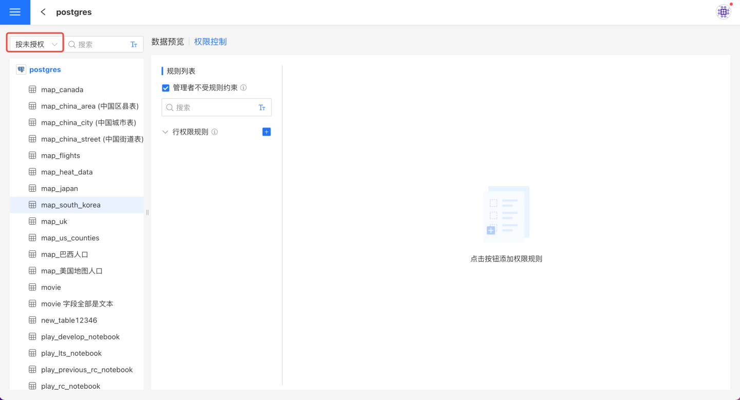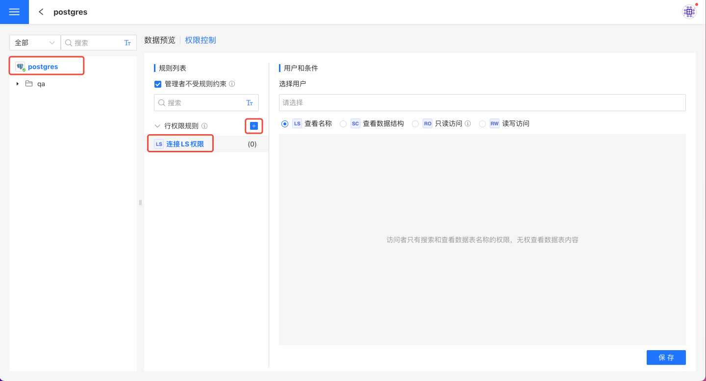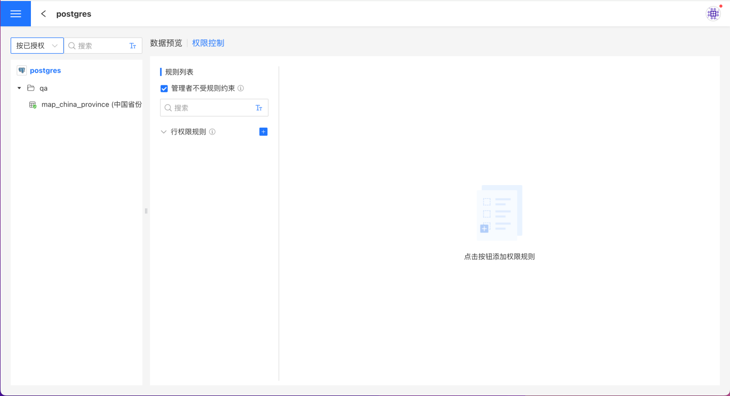在数据连接选择需要授权的连接,打开右侧的权限控制列表,点击+添加规则。在规则列表中生成一条空规则,修改规则的名称使其更贴合业务逻辑。