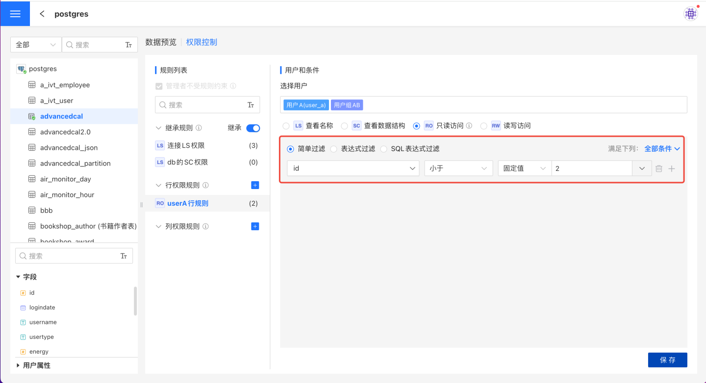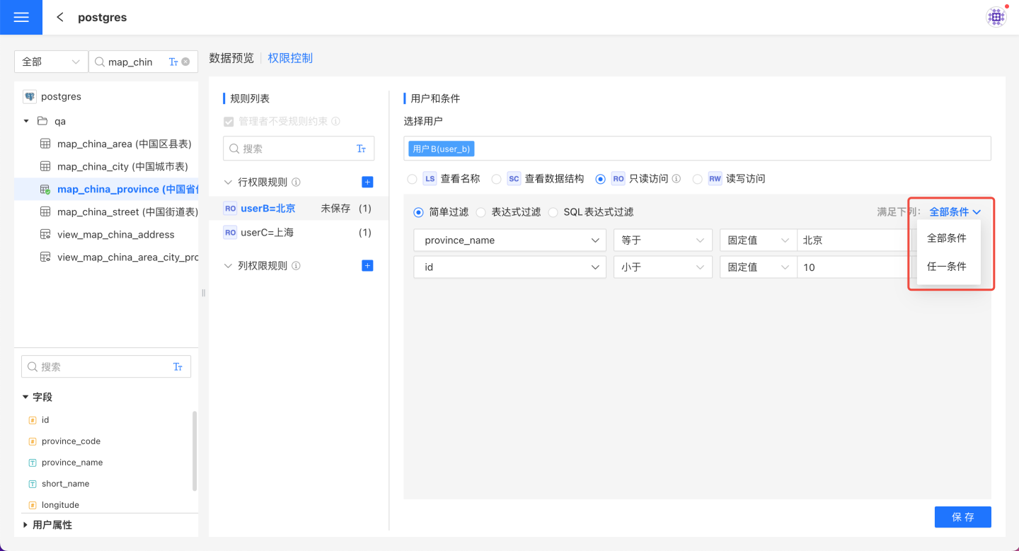 简单过滤 在简单表达式中可以通过固定值和用户属性来设置行权限控制。当有多个简单过滤条件时,可以设置规则为满足'全部条件'或满足'任一条件'。