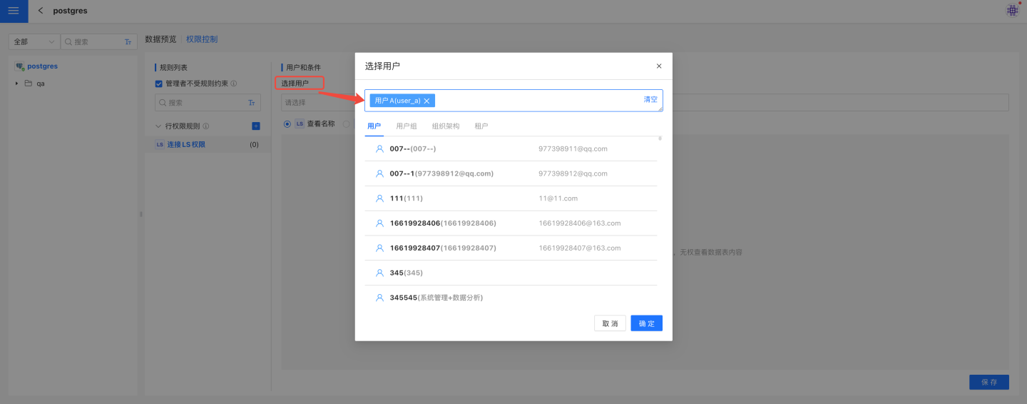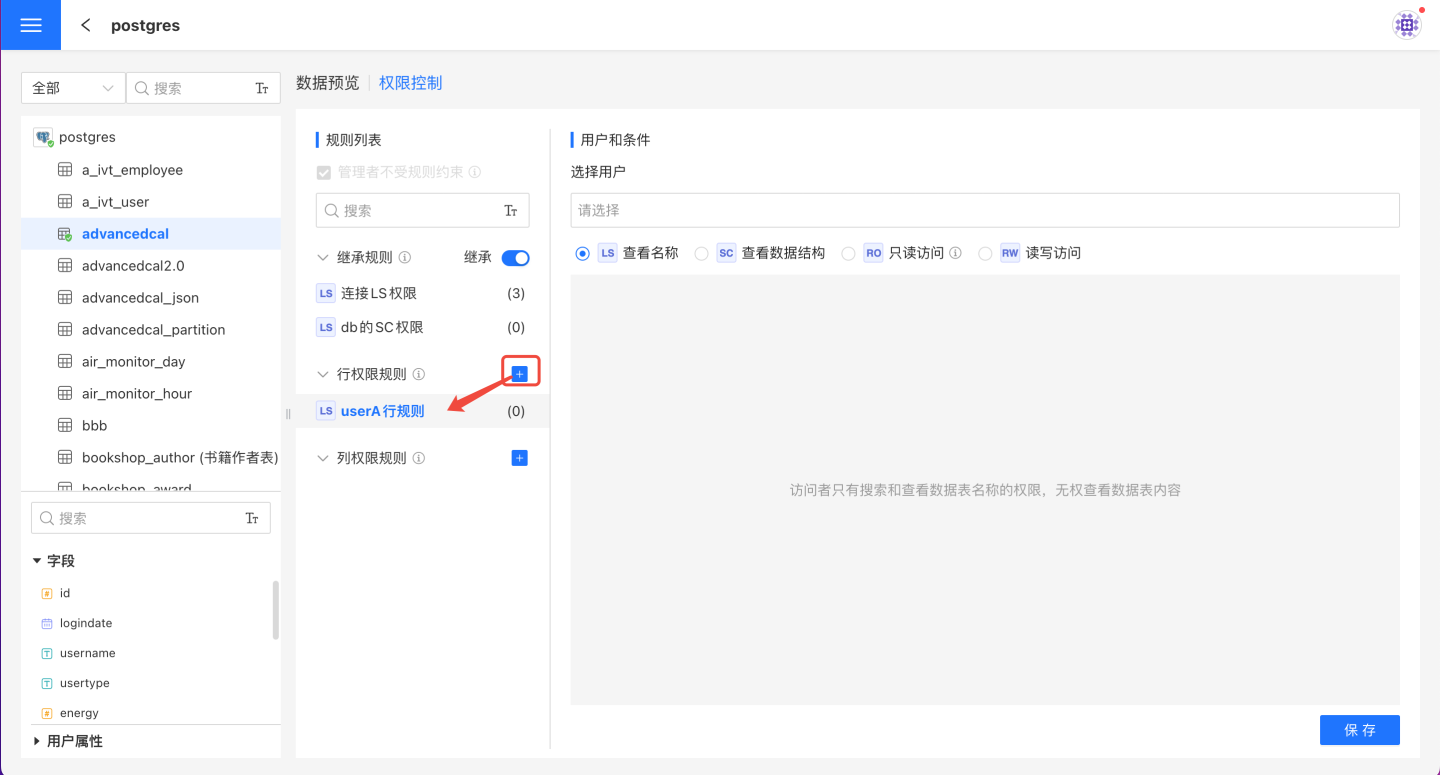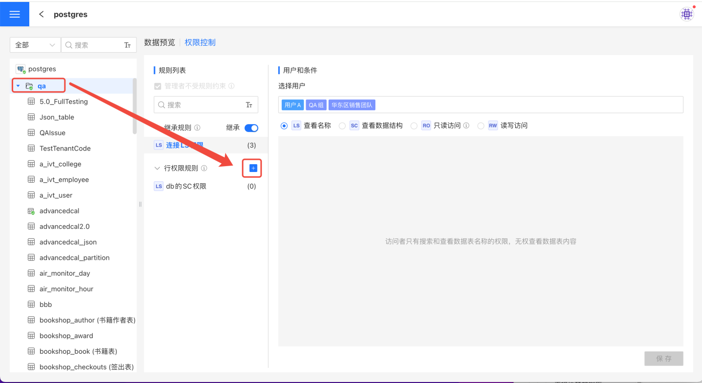 下面的示例是给表添加规则以及规则生效后授权用户查看情况。 第一步:添加规则