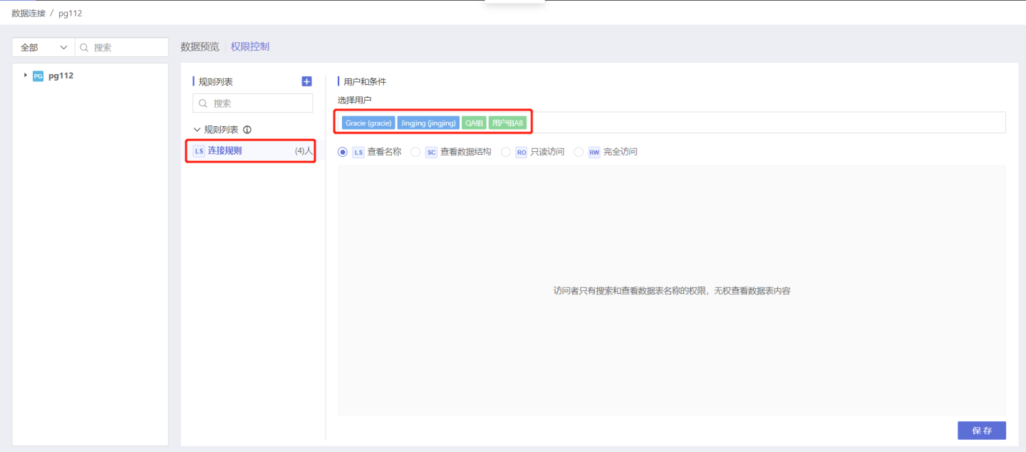 对数据连接进行权限控制能够实现对数据的分发,owner 可以通过添加规则决定让哪些用户访问数据连接中的数据。每条规则由授权用户和授权类型组成。