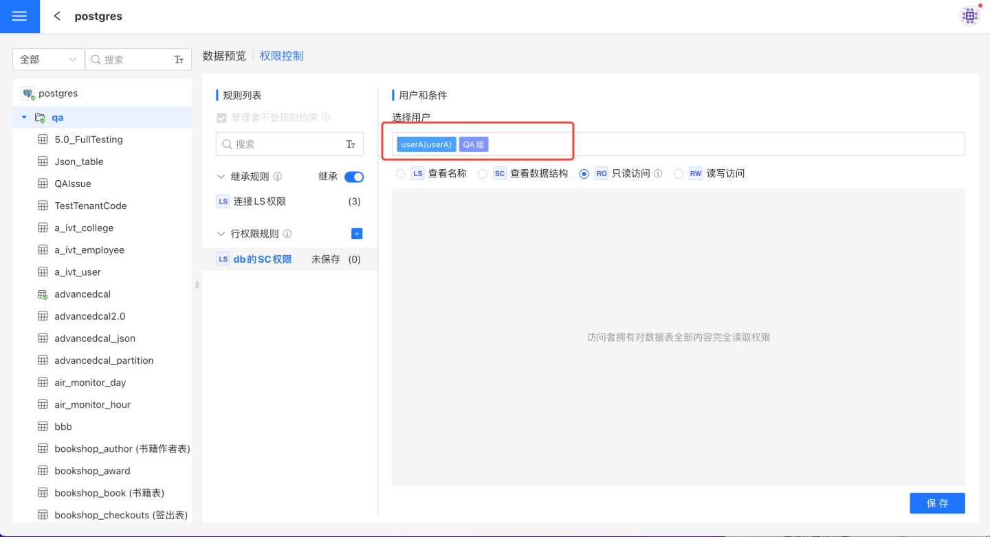 - 在表上设置时可以访问该表的名称、结构和数据。表的 RO 只读访问与其他授权类型不同,可以设置行、列权限。