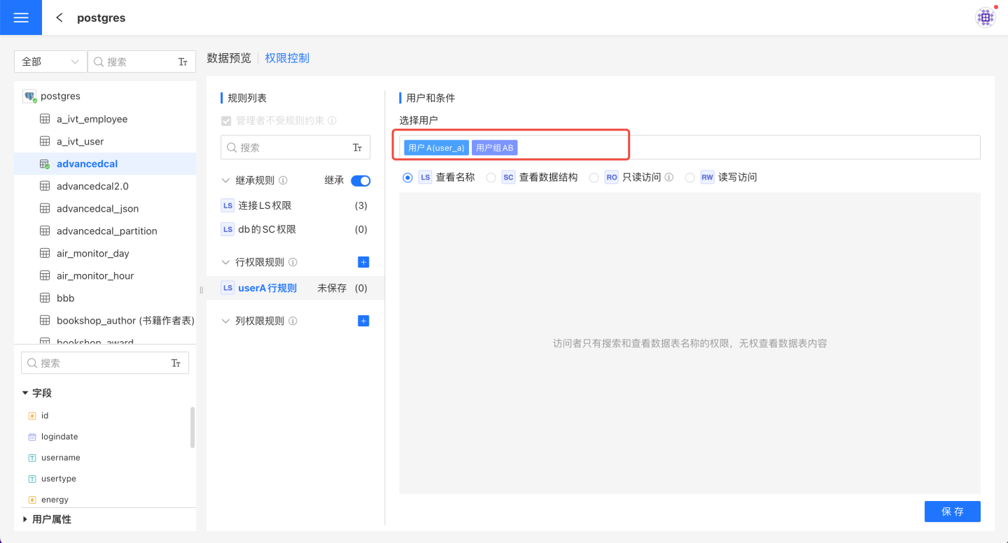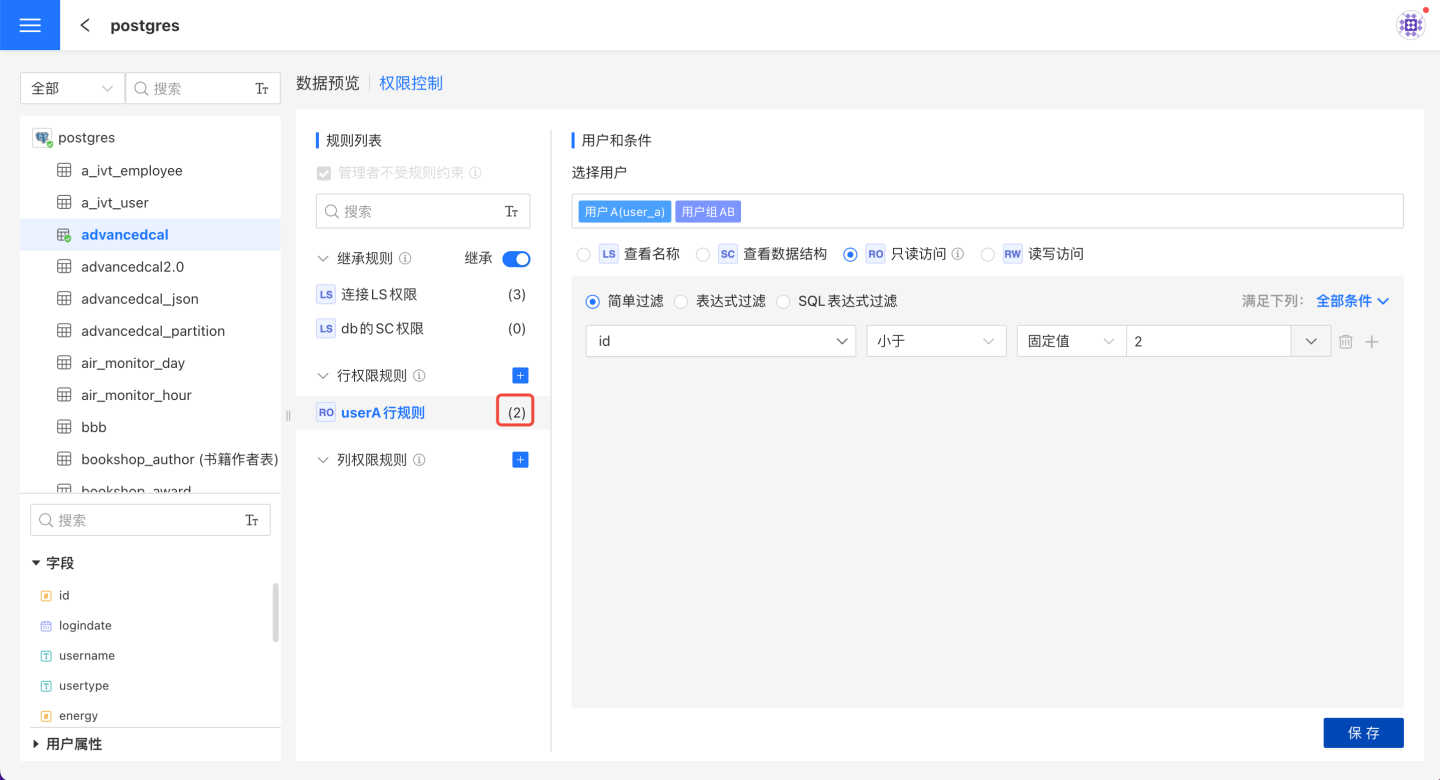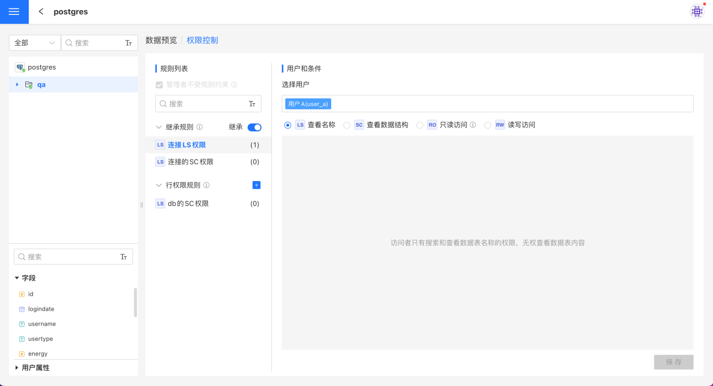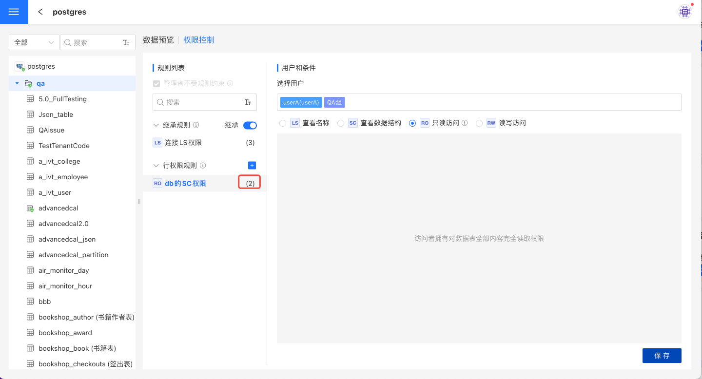 - 表会继承所属目录和连接上的规则,该规则在表的规则列表中置顶,且只能查看不能修改。