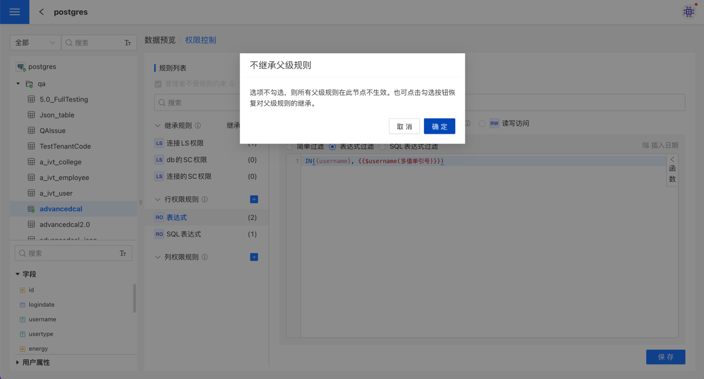 继承列表中显示了继承规则,是该表上一层级的所有规则,默认是继承该规则,也可以选择不继承。