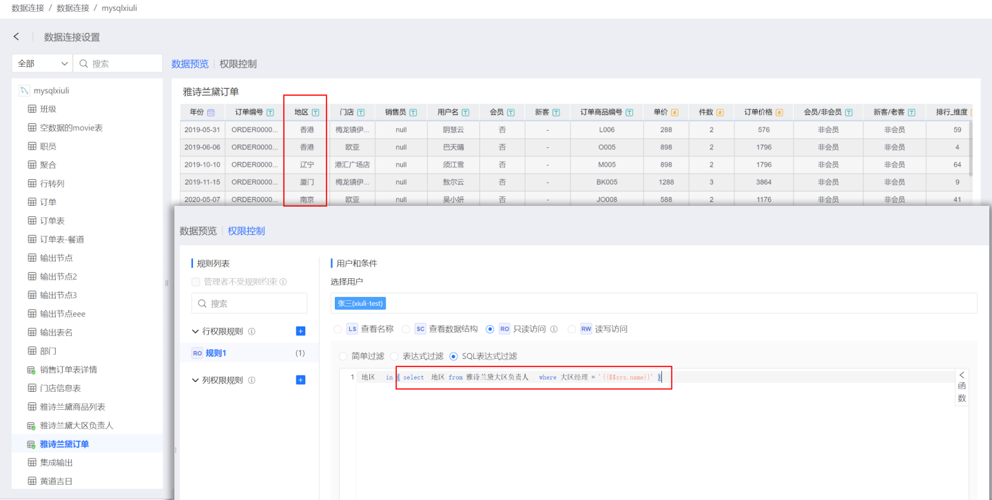 SQL 表达式过滤 可以通过 SQL 实现数据过滤,常用于跨表权限控制、复杂场景过滤使用。如图所示,用户查看订单表时,先要看自己在大区负责人表中负责哪些地区,才能查看订单表中对应地区的信息。如果用户在大区负责人表中没有对应的地区信息,那么订单表中就没有数据可以查看。