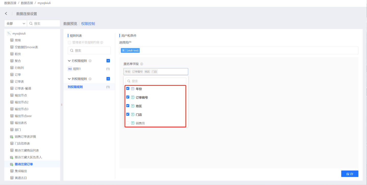 列权限设置列字段是否对用户可见,创建列权限规则后指定用户不能查看规则中的列字段内容。 如对用户张三设置了列权限规则,则张三在查看该连接时,看不到年份、订单编号、地区、门店等列字段相关信息。