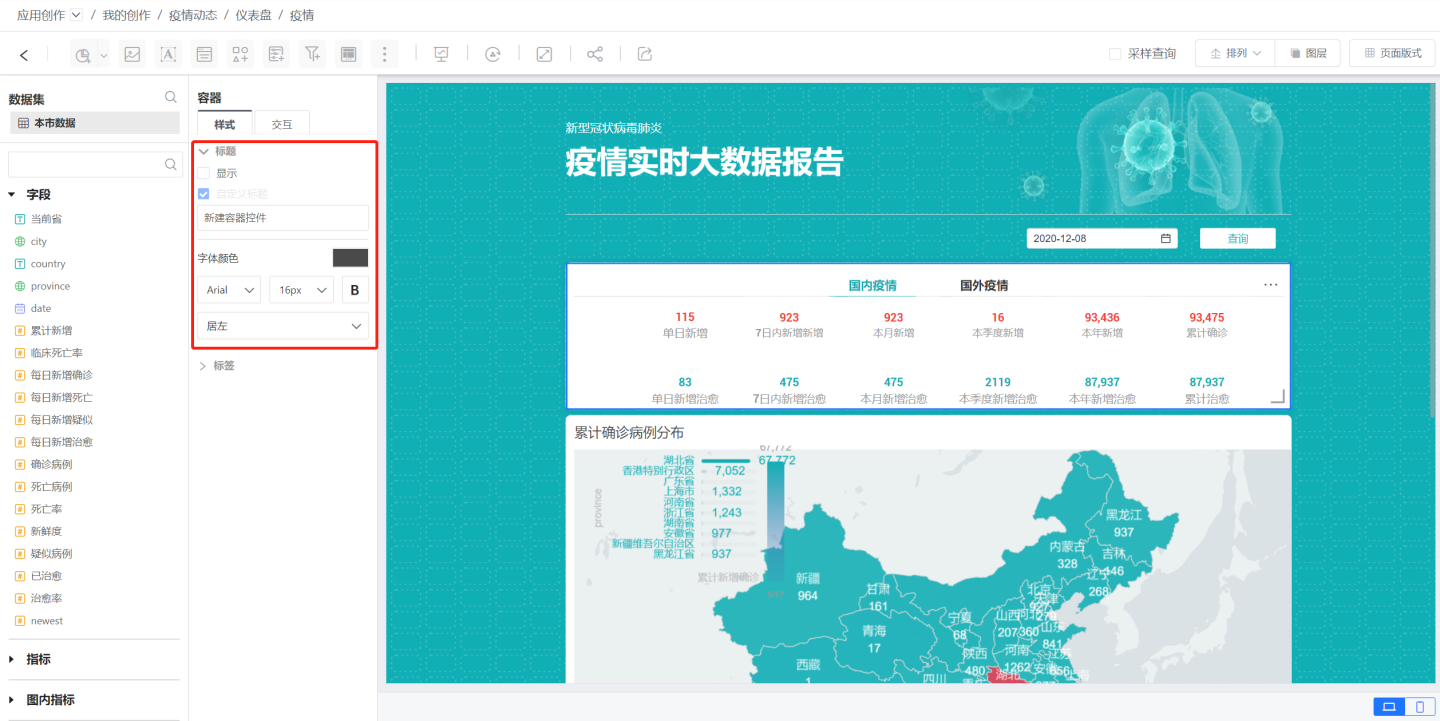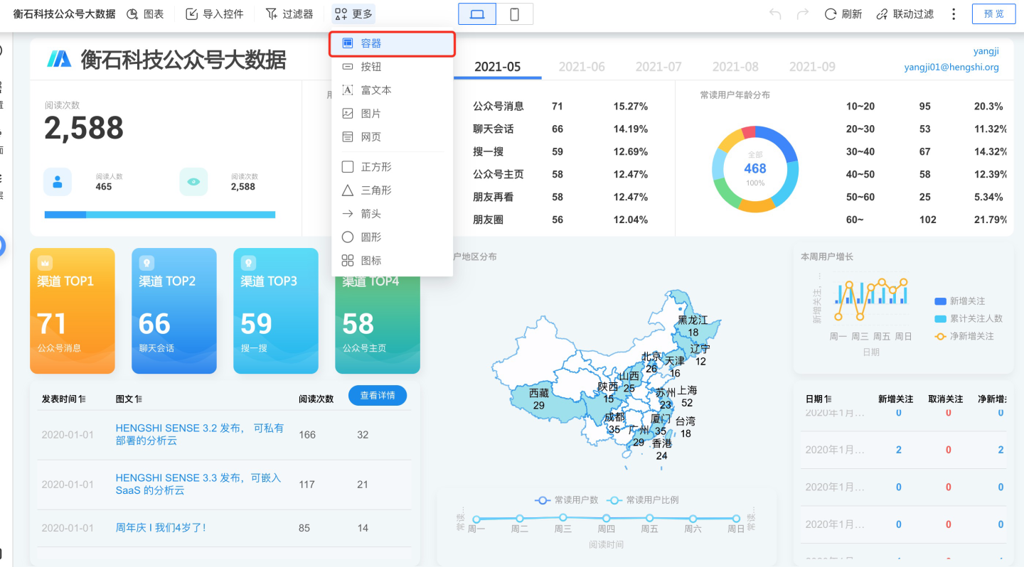 可将容器作为卡片使用在容器内填入所需的图表内容,制作成组合卡片的形式,也可在大屏展示时, 在某一个区域内添加需切换展示的内容,滚动播放。