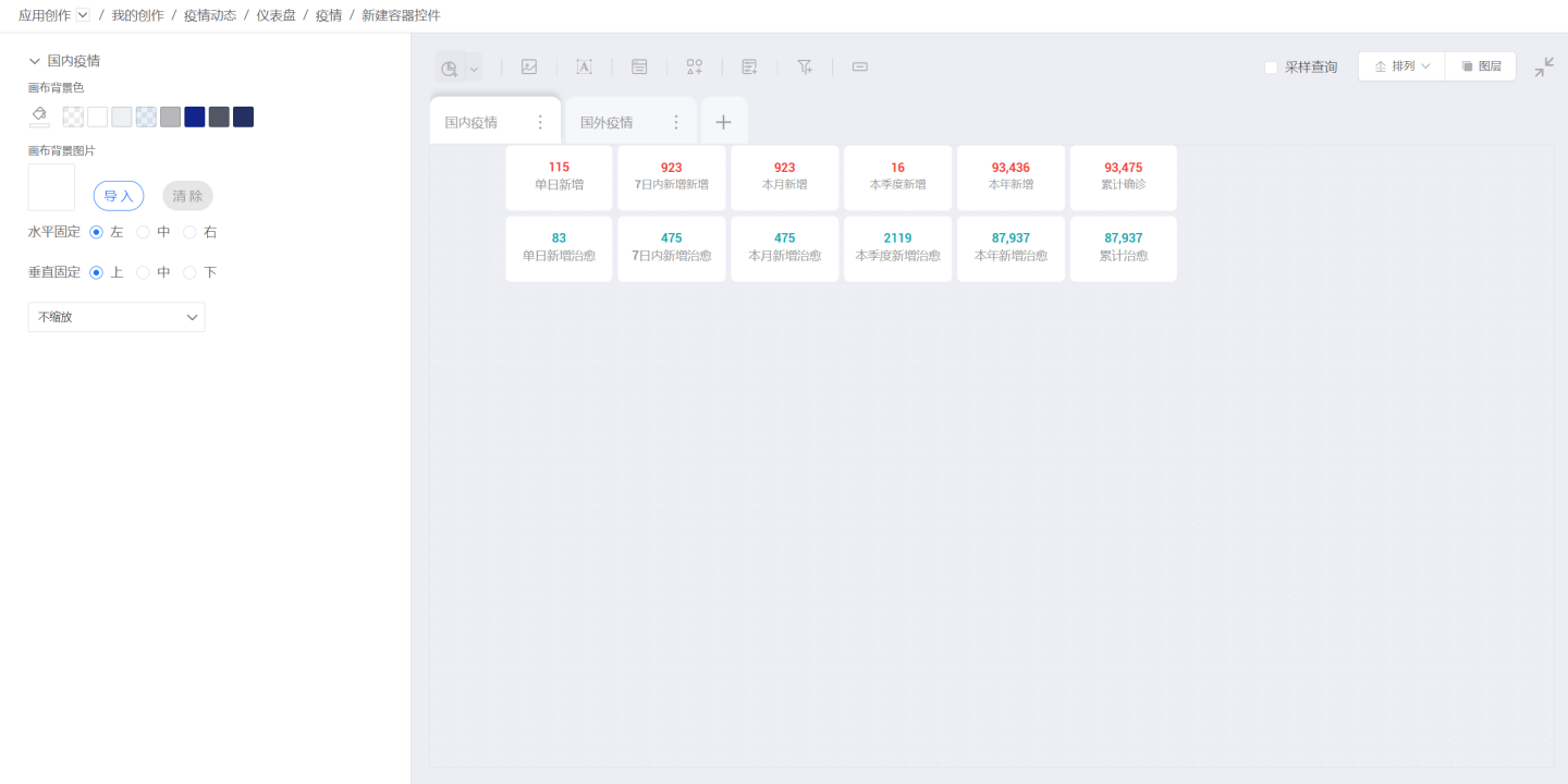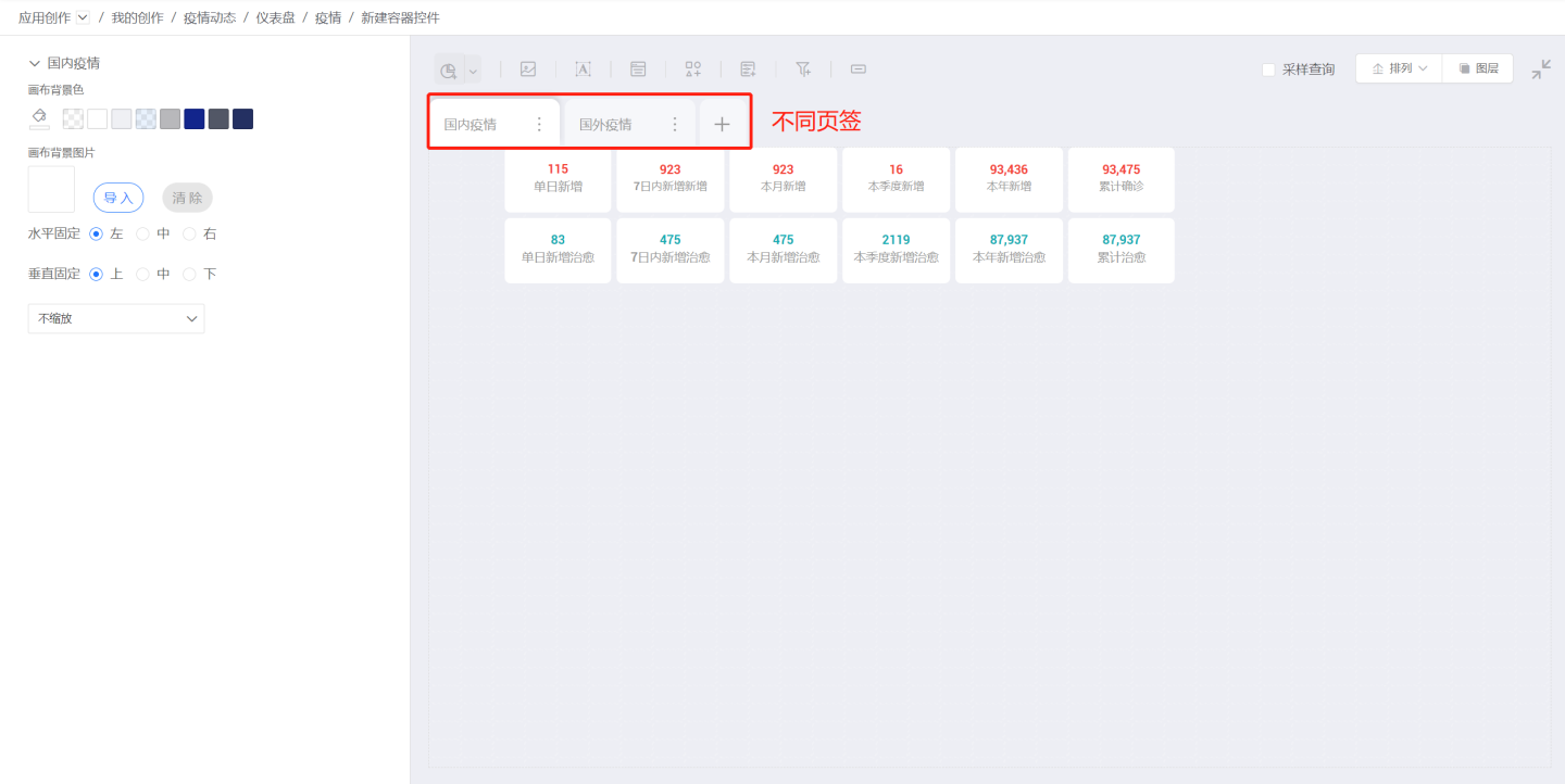 此时,让我们回到仪表盘预览一下下效果(如下图) 可以看到因为我们新添加了一个容器页面。 所以容器标签也增加为了2个。 同时,在容器内部 tab 中给页面重命名了名称。 此时我们就可以点击标签切换容器页面了。