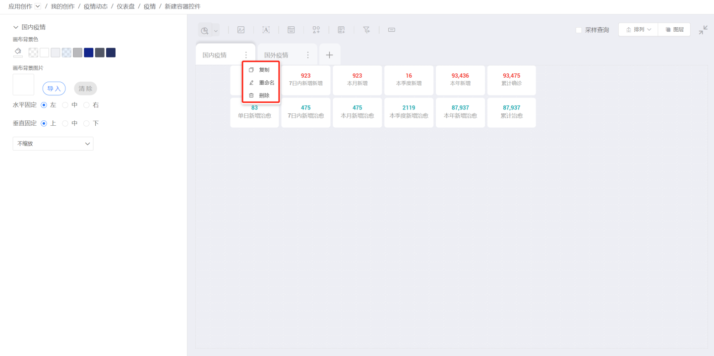 - 删除: 将对应页面删除,删除后删除页面,同时页面内的图表及控件将被删除 同时,鼠标点击 tab 拖动,可对容器页面的顺序进行调整
