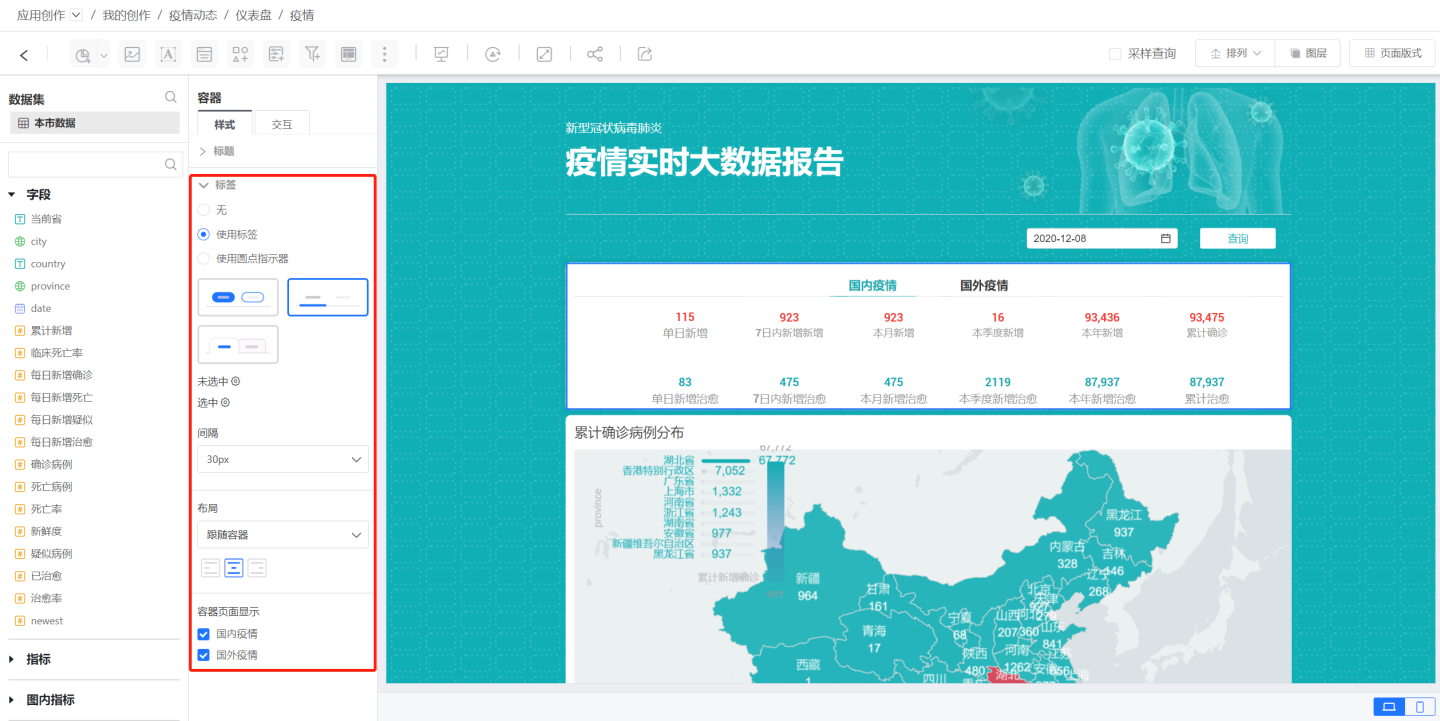 可以在有限的展示范围内尽可能多的展示内容。 同时也可以根据业务场景需求在同一仪表盘内,切换展示不同数据集的可视化图表内容。