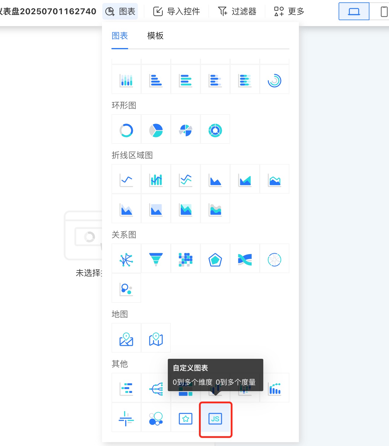 自定义图表与其他图表不同,其他图表是通过拖拽实现的,自定义图表是通过编写 JS 代码实现的,所以创建过程与其他图表也不相同。下面介绍创建自定义图表过程。