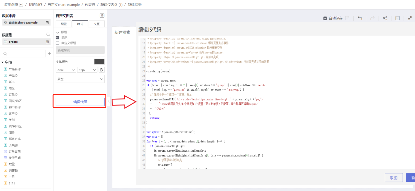 - 编写代码。 在样式中点击编写代码,进入代码编写界面。请参考自定义图表 API提供的 API 接口。