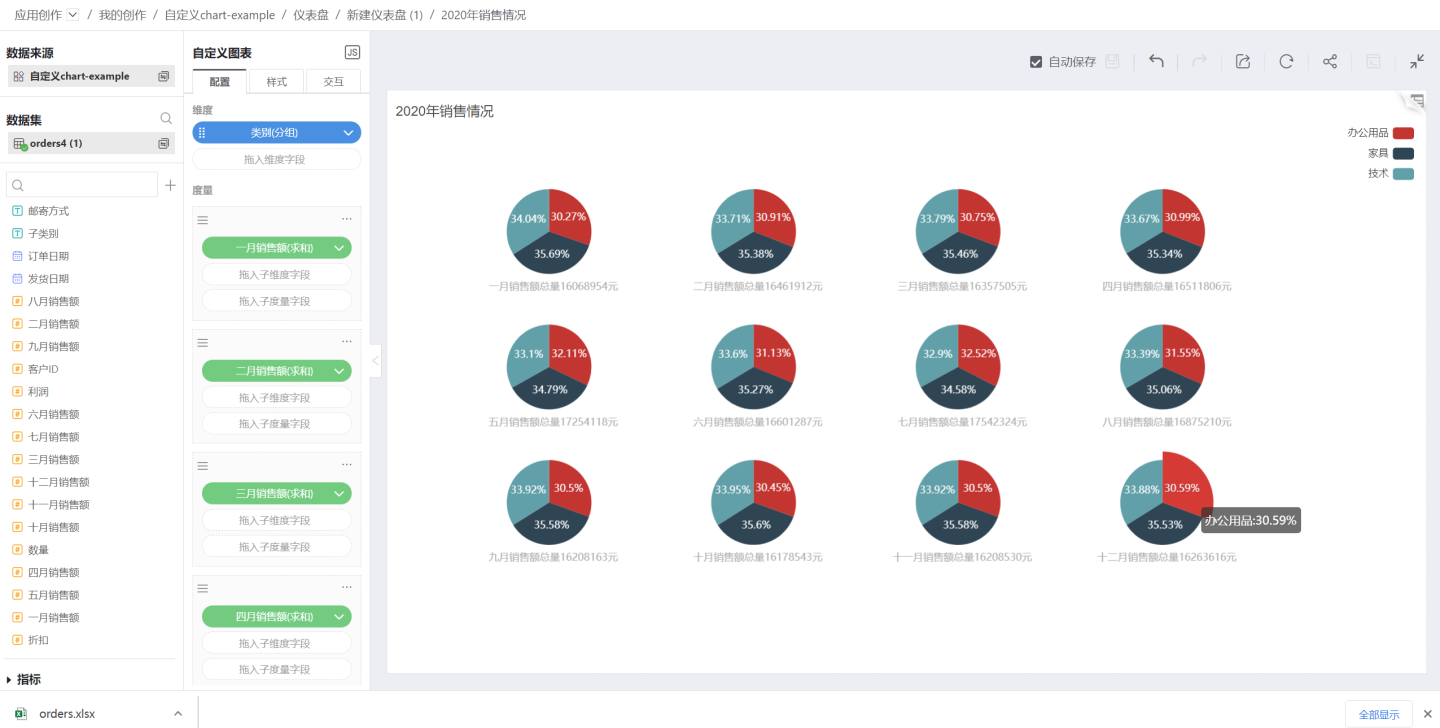 - 设计图表。 自定义图表创建前,请先设计图表。包括图表样式,维度、度量、交互操作等相关信息。 如某个图表展示一年中各月份的各类产品的销售情况,一个图表展示十二张饼图。 在维度拖入产品类别,度量中拖入各月份的销售数据。