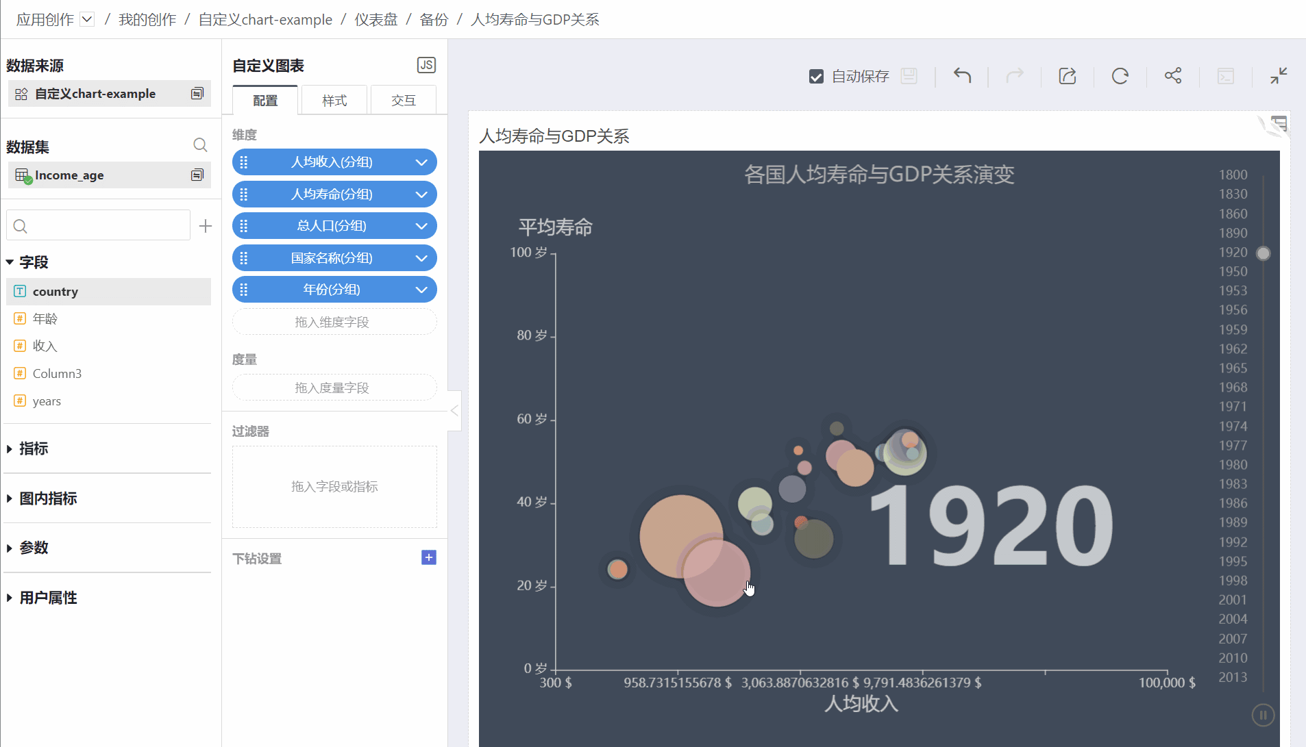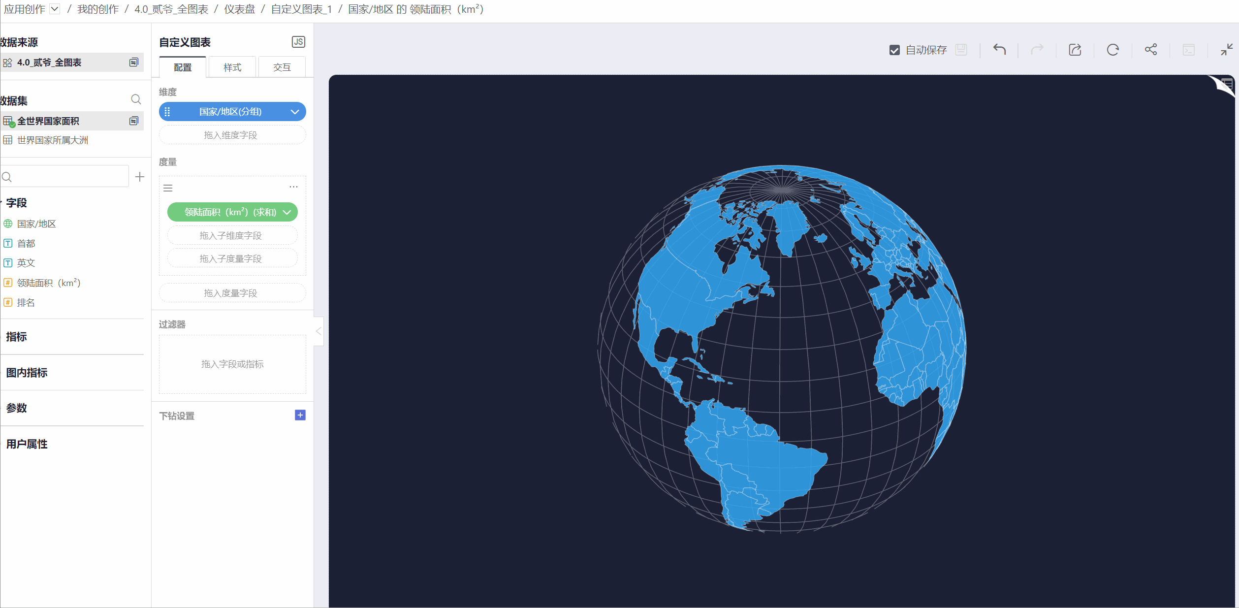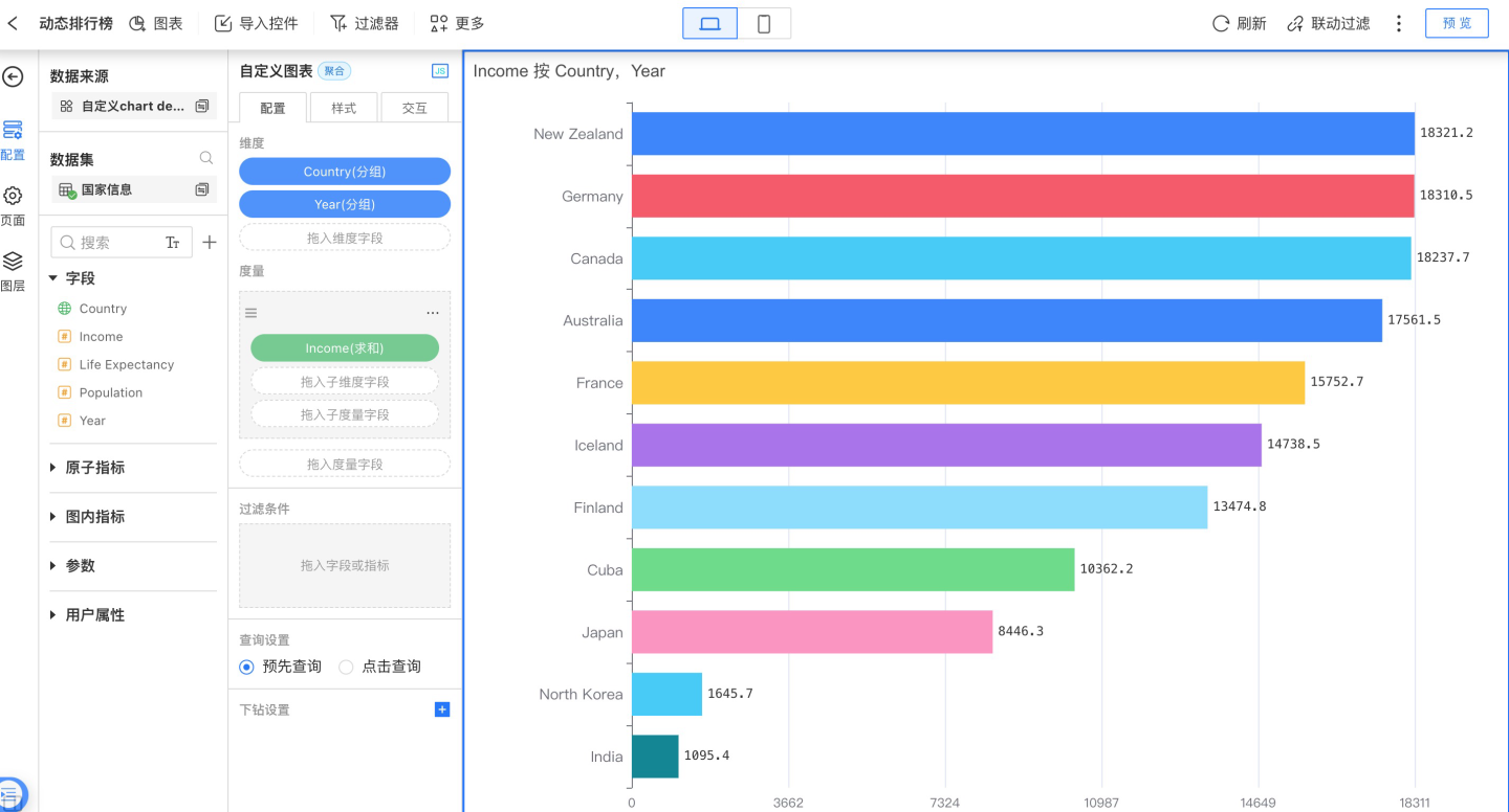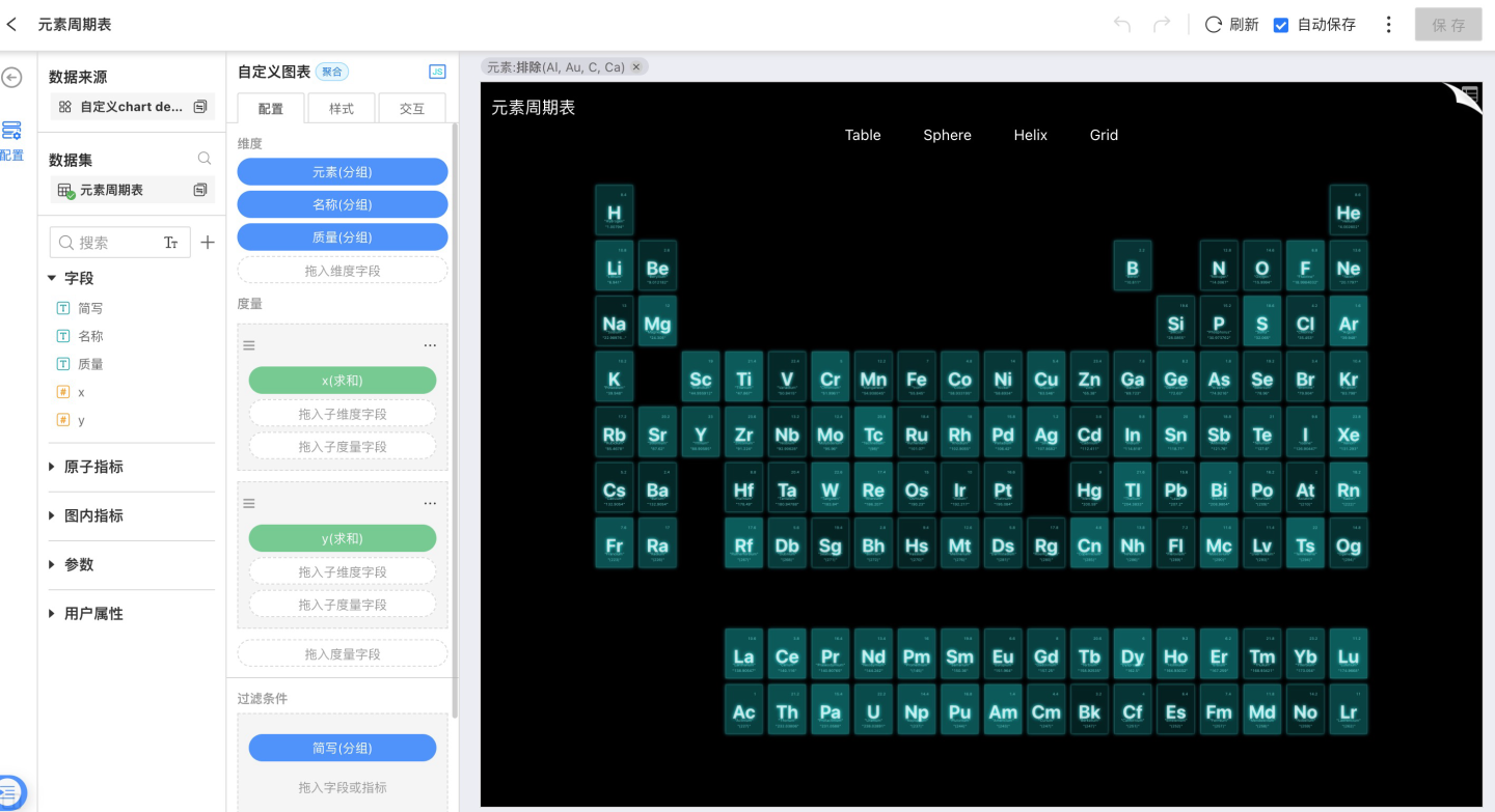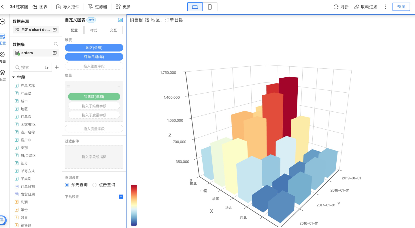 自定义图表支持图内过滤器、下钻和与其他图表交互功能。