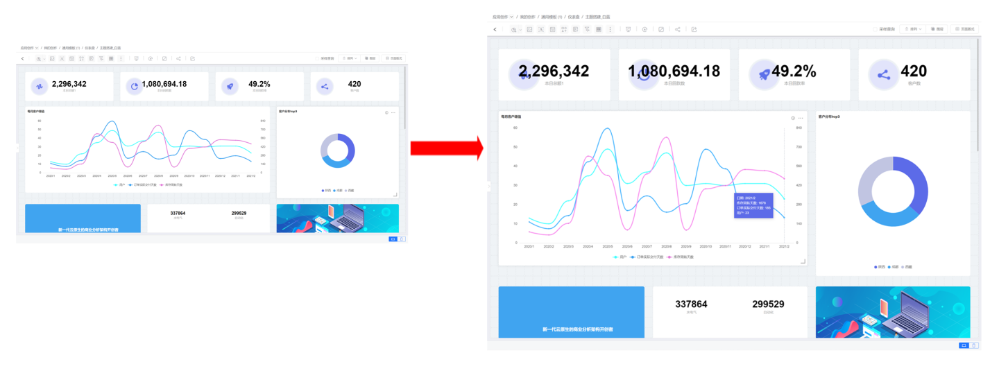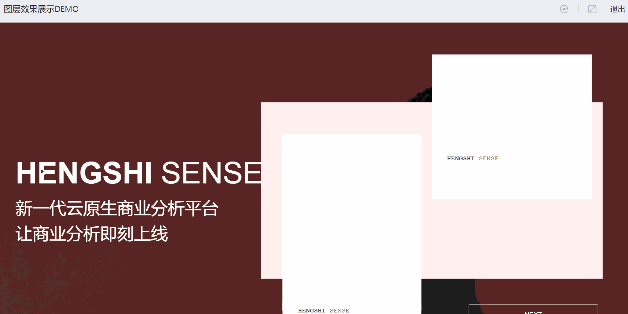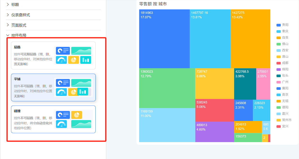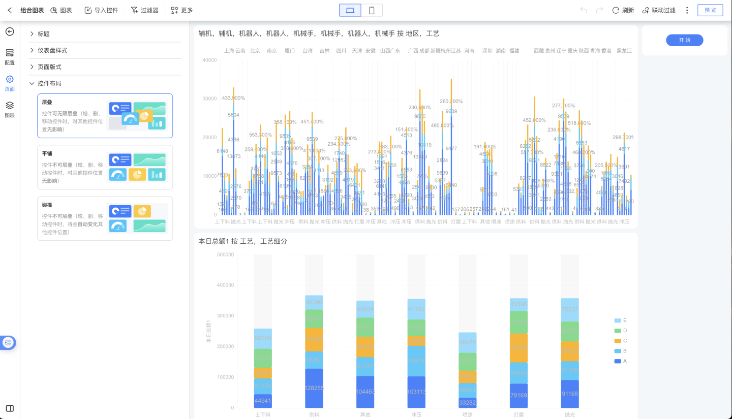 层叠模式将图层一张张叠放来实现控件相互嵌套的合成效果,能制作出复杂场景的展示效果,可以在展示分析数据的同时展示样式更加美观、更加多样化。 如下是通过层叠模式制作出的示例。