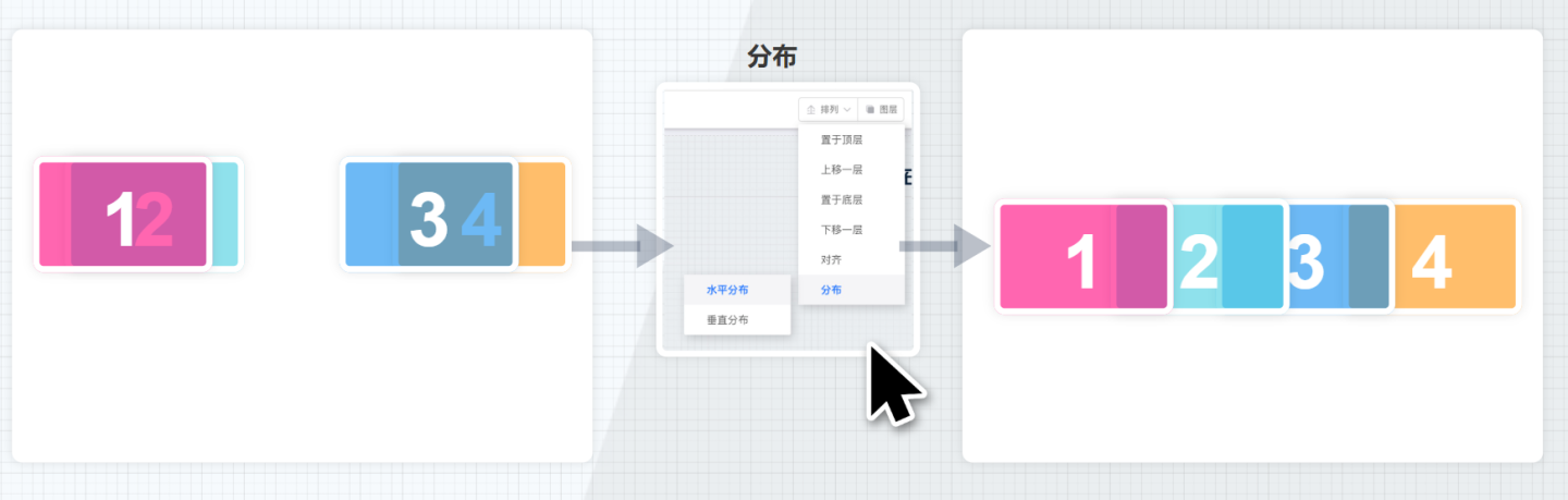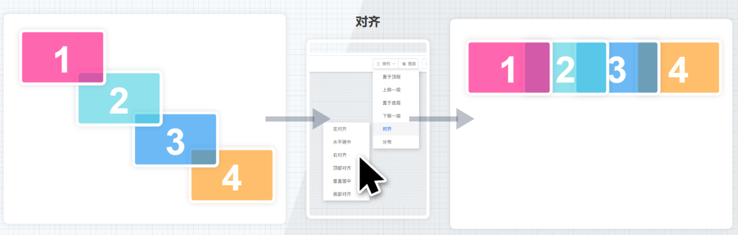 除了调整图层顺序外,排列中还支持对多控件进行对齐和分布操作。 对齐包括左对齐,水平居中、右对齐、顶部对齐、垂直居中、底部对齐。