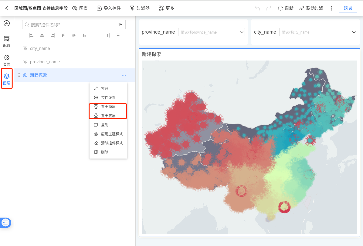 选中控件,点击排列按钮,可以对选中控件进行图层位置顺序进行快速调整,包括置于顶层、上移一层、置于底层、下移一层等操作。