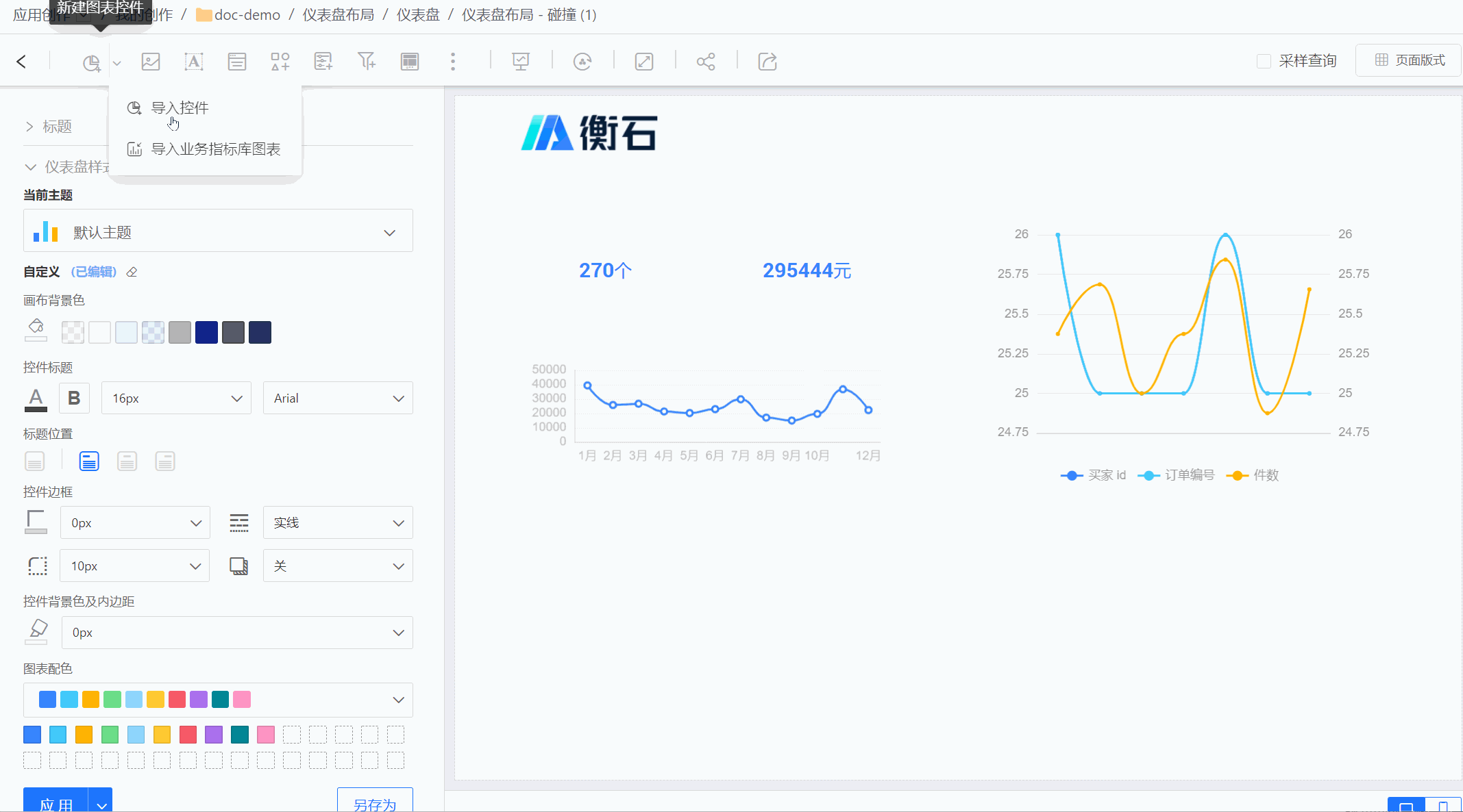 仪表盘编辑时也可以调整固定尺寸展示模式,可在底部进行缩放、充满画布、显示全部等模式切换,方便用户编辑时查看图表展示效果。