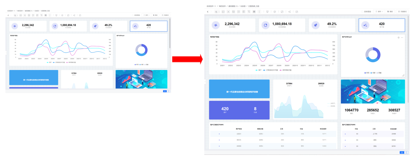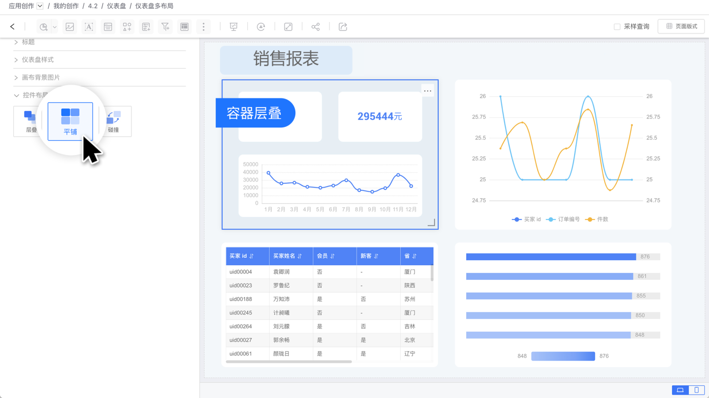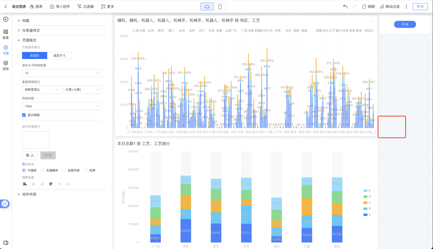 如下图所示,整个仪表盘使用平铺模式,某一个局部需要使用层叠模式展示。这种情况下,局部展示效果使用容器来实现。