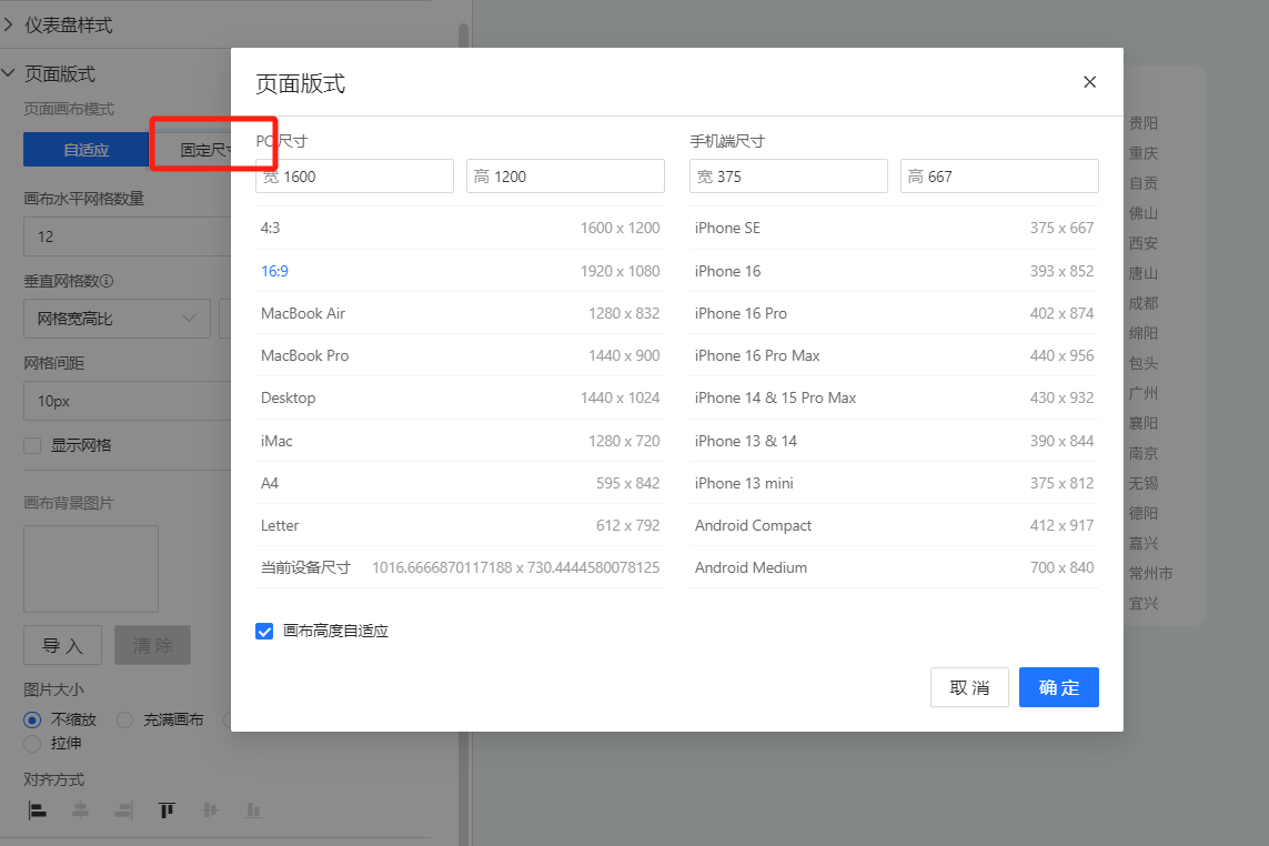 固定尺寸模式表示页面的尺寸是固定不变的。 针对桌面端以及移动端可以分开设置不同的画布尺寸,预定义尺寸如下图所示,同时根据需求可以设置自定义尺寸。