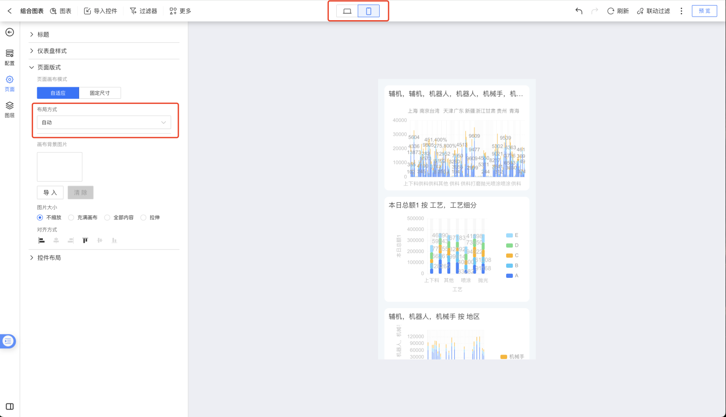 移动端自适应模式下布局方式支持自动和手动两种方式。自动指由系统布局,用户无法移动控件。 手动模式与 PC 端的配置一样,参考相关说明进行配置。