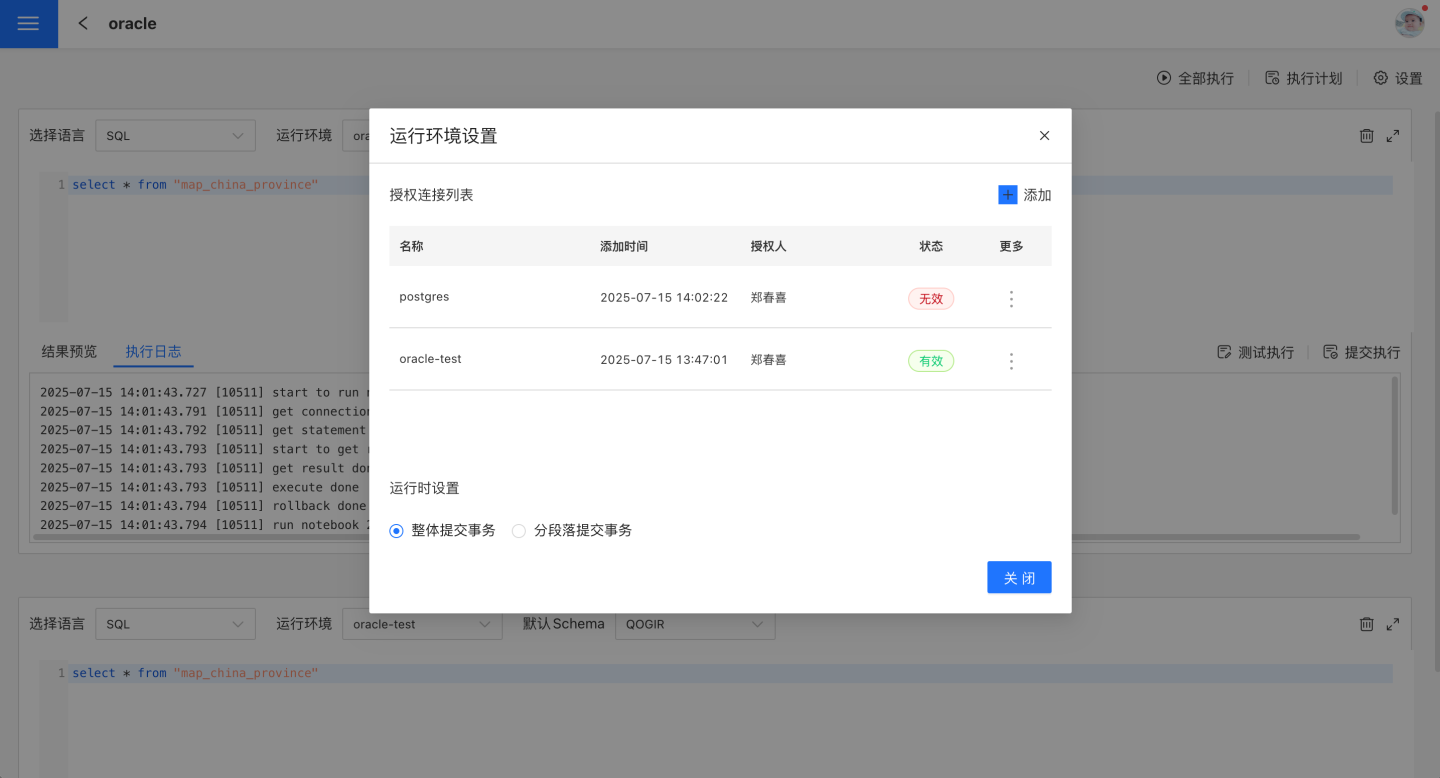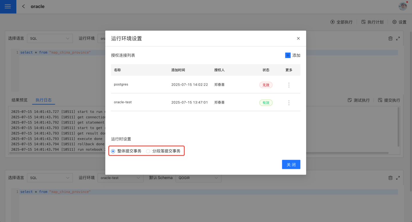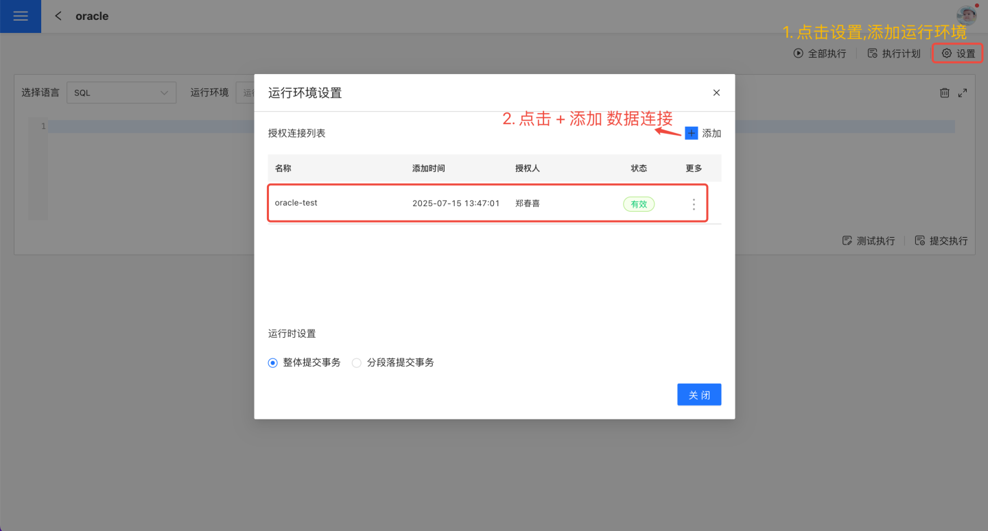 在笔记页面中,点击设置进入运行环境设置页面,添加代码运行需要的数据连接和事务提交方式,如图所示。