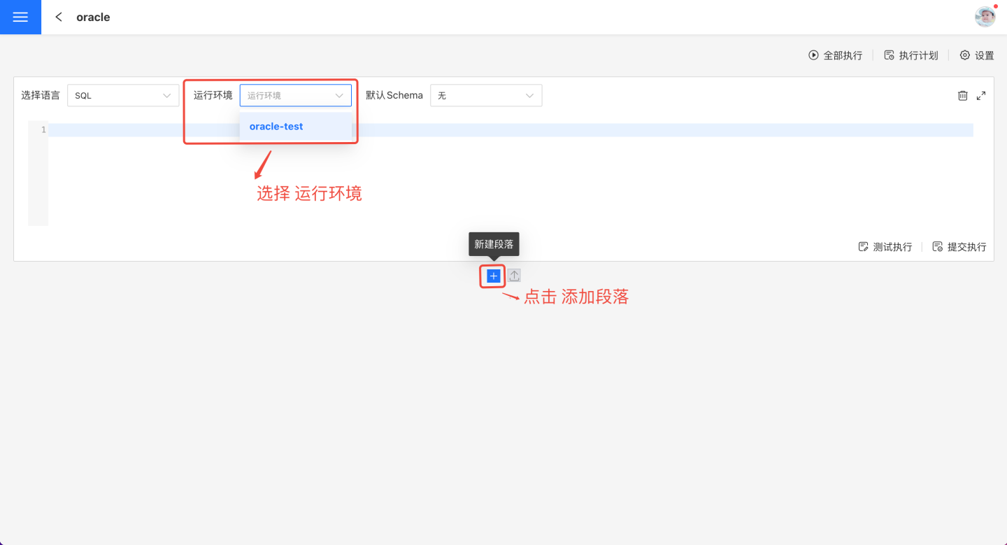 点击“+”号新建段落,选择语言、运行环境和默认 Schema。