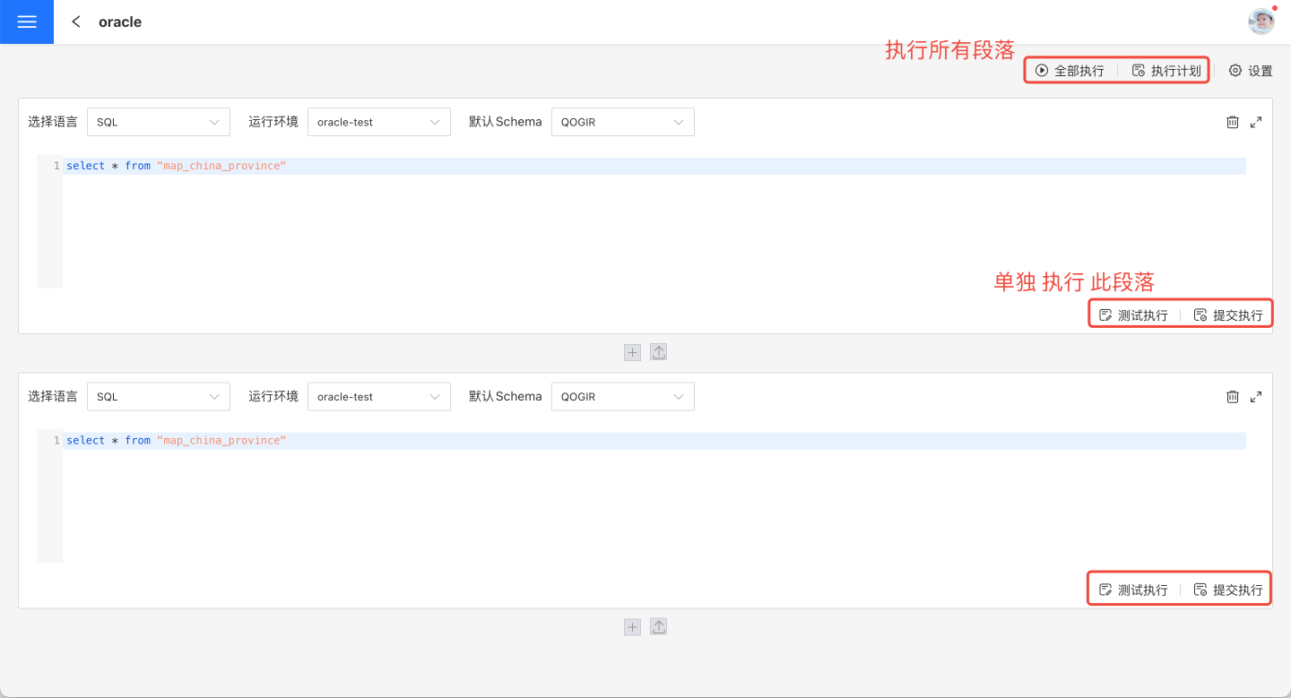 段落的代码编写完成后,需要进行执行,查看运行结果。 段落支持测试执行和提交执行。