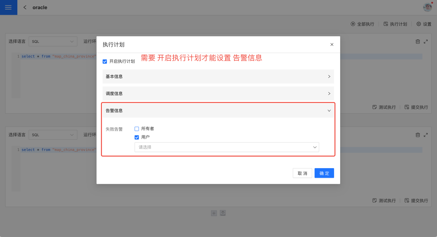 除了手动执行外,笔记可设置执行计划,按照设定计划运行。 点击右上角的执行计划,进入执行计划设置页面,设置计划的基本信息、调度信息、告警信息。