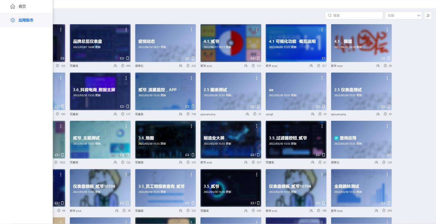 应用集市模块中展示了其他用户发布的应用,数据查看人员可以查看这些应用,包括查看数据、导出数据、导出应用模板,也可以嵌入分享这些应用和应用中的图表。