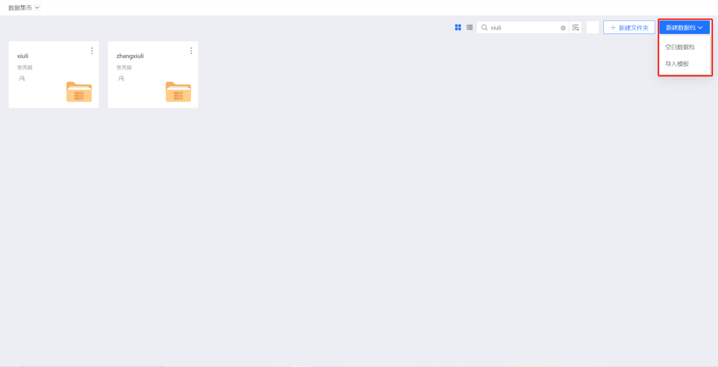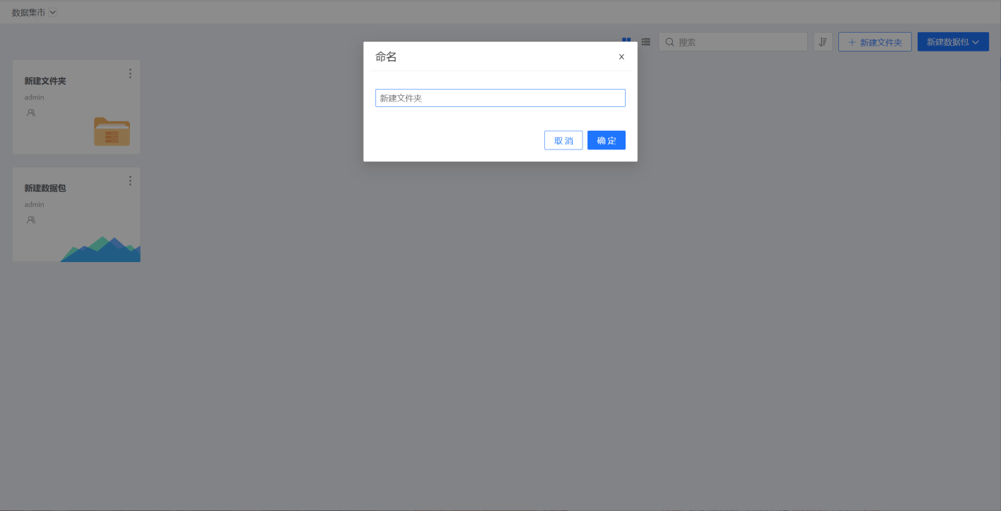 拥有系统管理者角色的用户才可在数据集市中新建文件夹,文件夹内仍可新建文件夹、新建数据包。