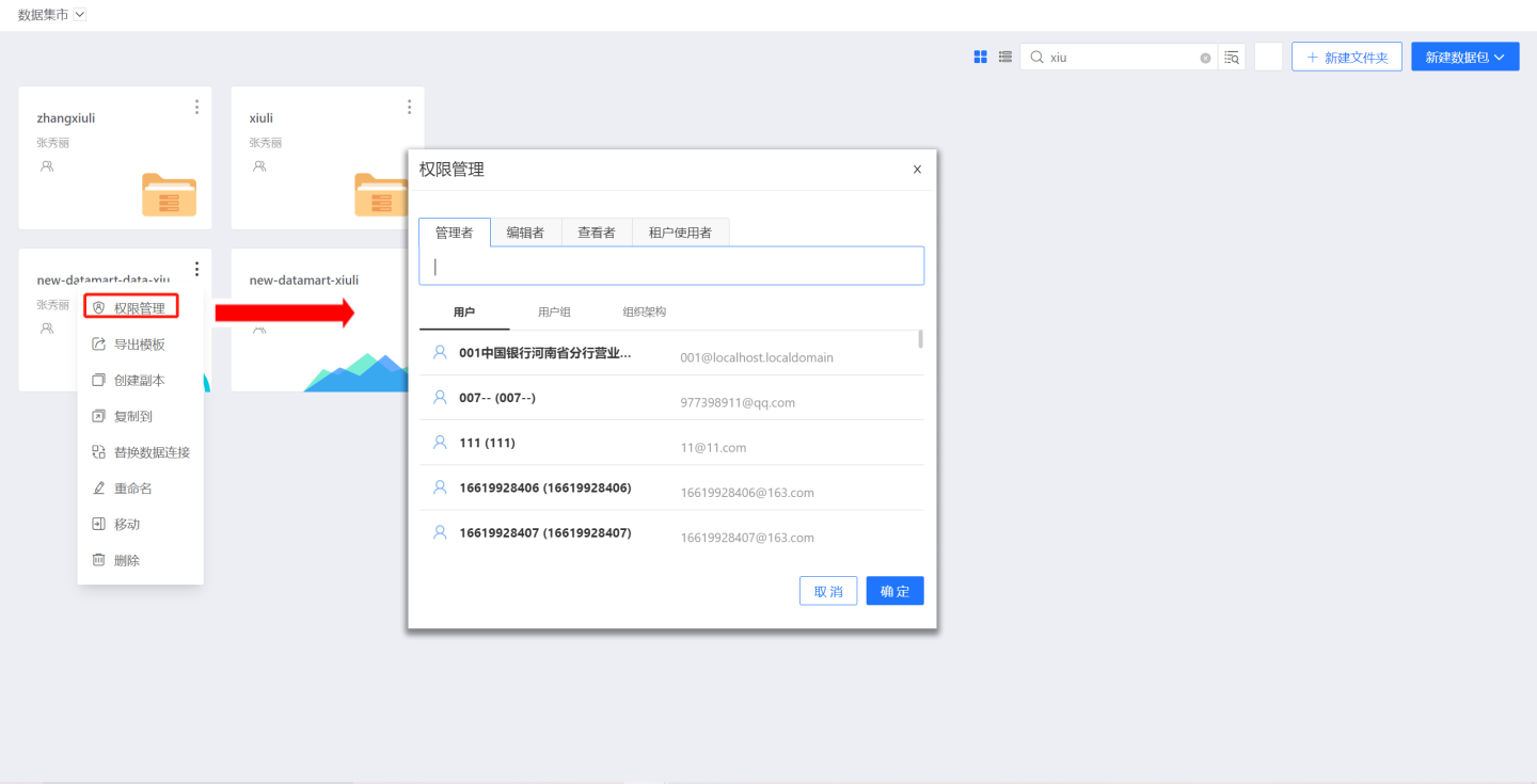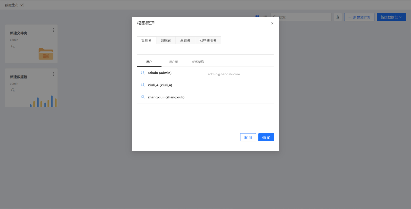 拥有数据包管理者权限的用户,有权给用户、用户组或者组织架构授予管理者、编辑者或查看者的权限。