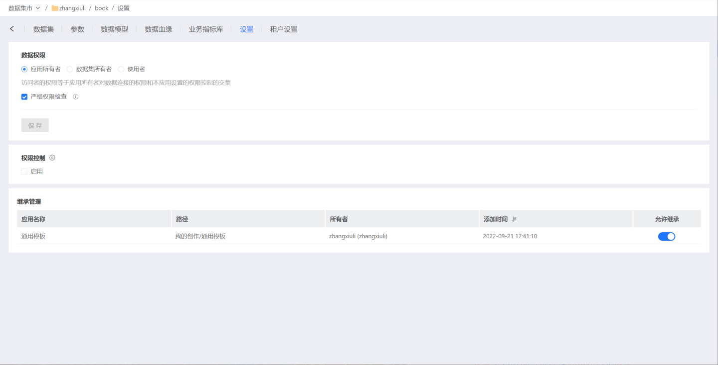 当应用需要继承数据包中的数据进行数据分析时,应用会向数据包发送继承申请,数据包管理者决定是否允许应用继承。 当开启允许继承开关后,应用会展示继承数据集,可以使用继承数据集进行数据分析。