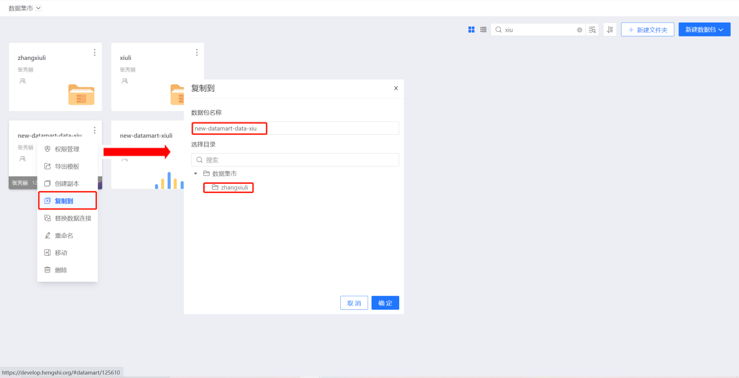 数据包菜单中有复制到按钮,点击复制到会展示复制弹窗,在弹窗中选择数据包复制的路径,点击确定后,数据包复制到对应的路径下。
