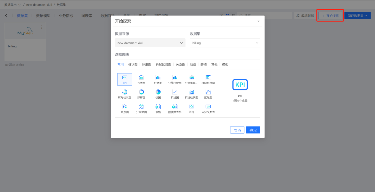 数据集市中,只可在数据包中新建探索,点击数据包右上角开始探索图标,弹出"开始探索"窗口,选择图表类型后即可开始探索。 图表相关操作请参考仪表盘控件使用说明。