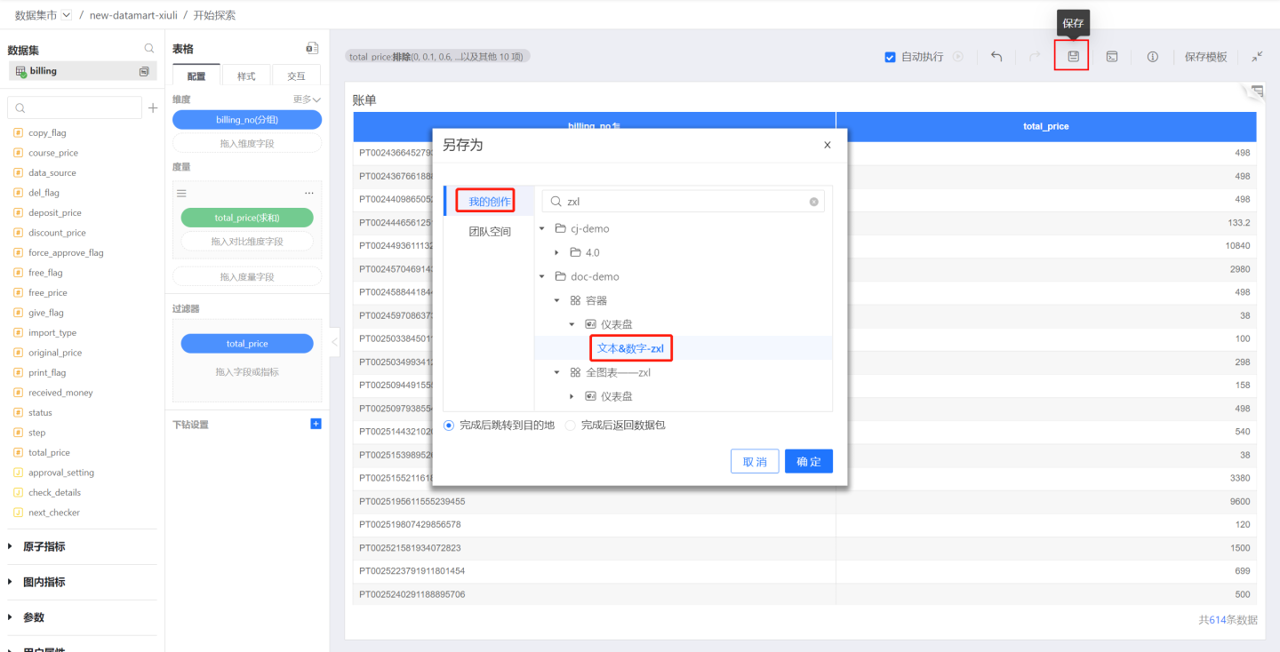 新建探索后可选择将图表保存到应用创作我的创作或团队空间中的仪表盘内。仪表盘可以是新建的仪表盘也可以是已经存在的仪表盘。