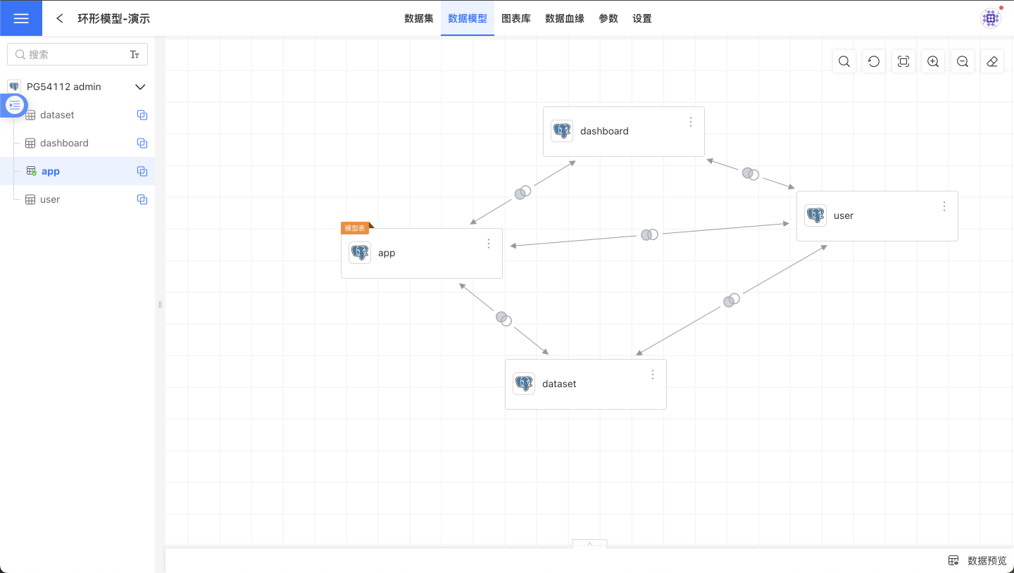 启用环形模型功能有两个选项,它决定了当前从表是否可以有多个上游数据集。独立关联关系表示当前从表只能有一个上游数据集,共享关联关系表示当前从表可以有多个上游数据集。启用共享关联关系通常用于多维度表多事实表的场景中。 下图的场景中,user数据集做为用户信息,关联app、dataset、dashboard数据集。这样可以在用户维度同时分析app、dataset、dashboard数据集。