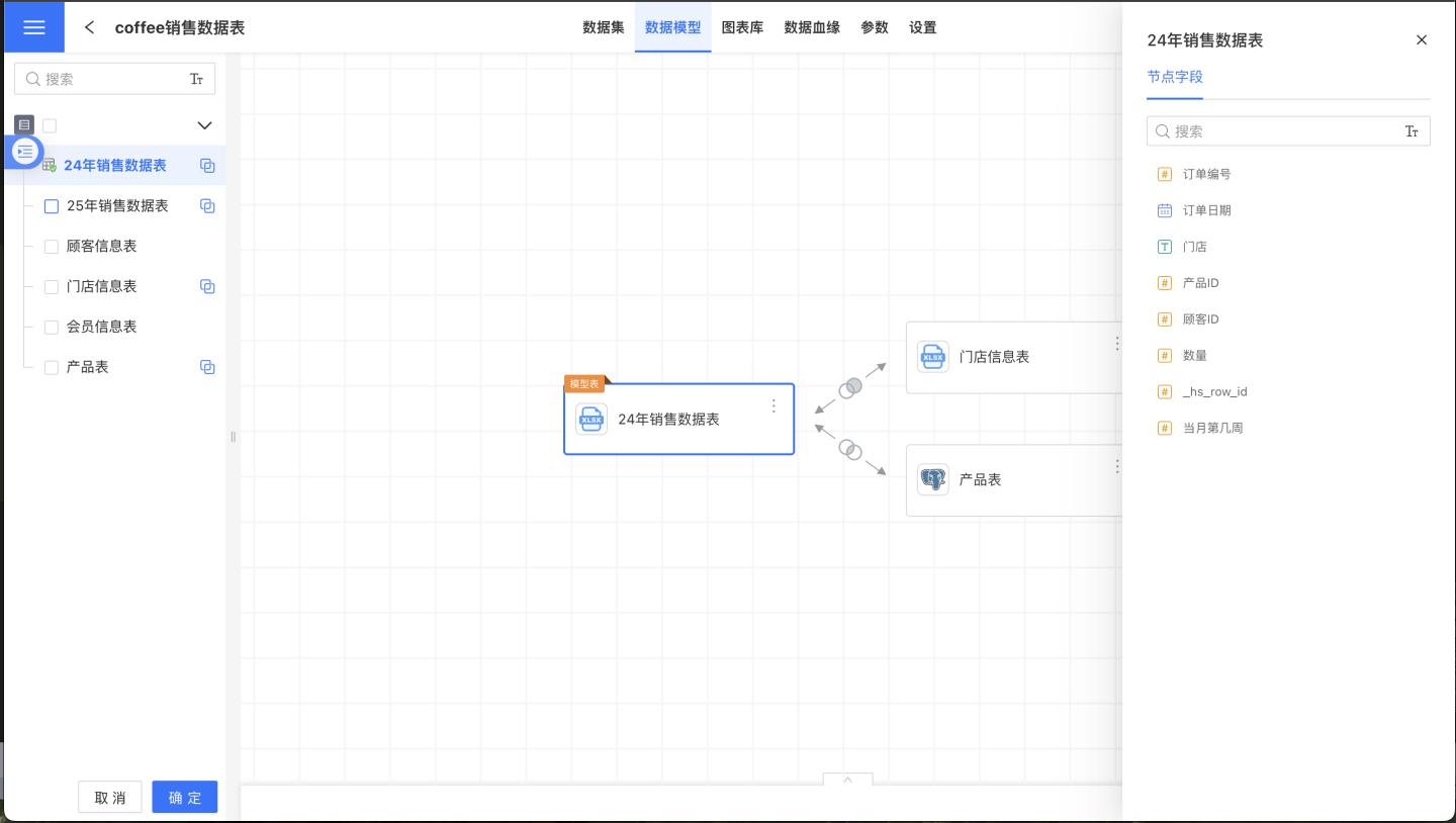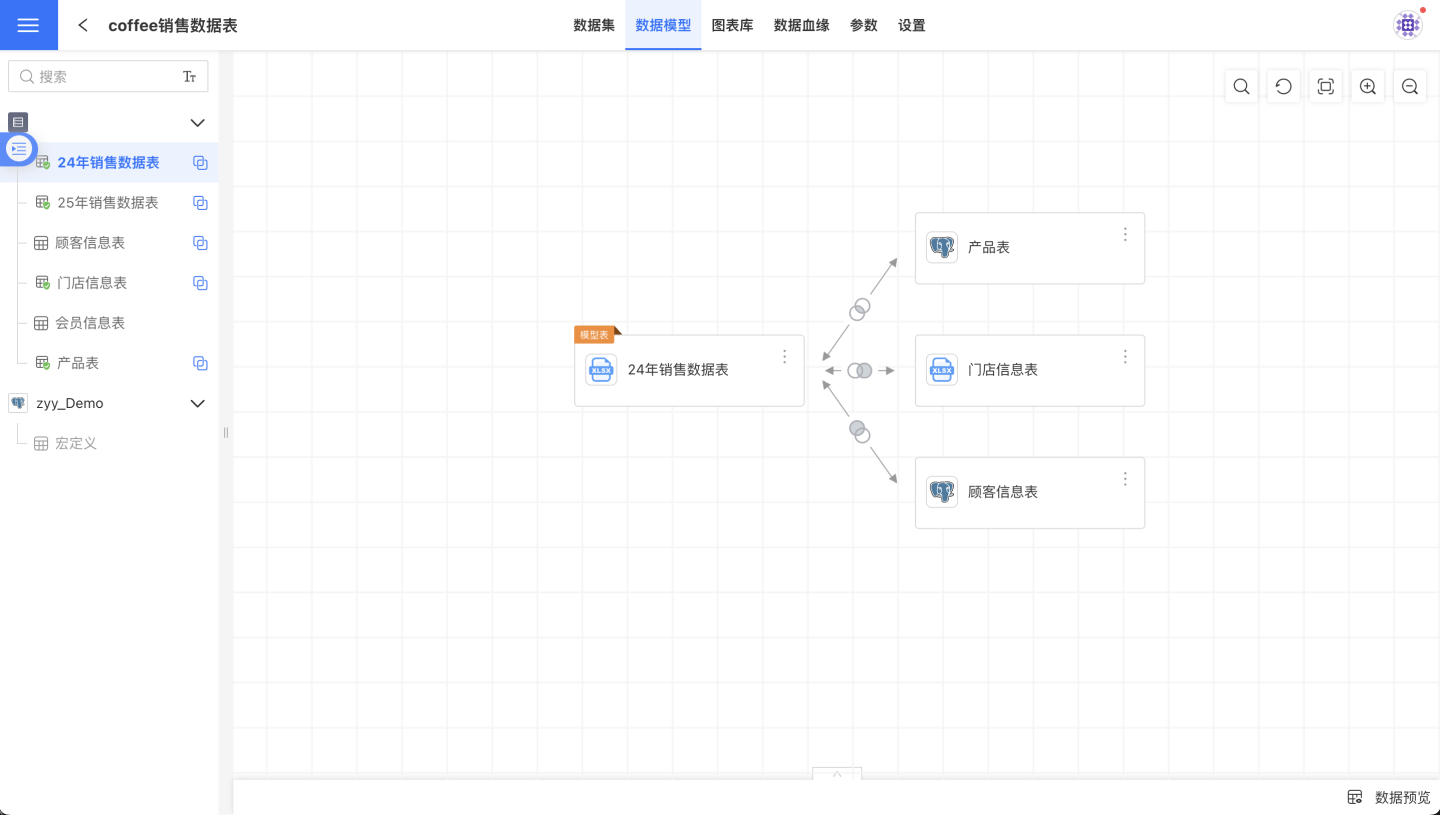 在衡石中定义的数据模型,数据集是维度表或者事实表是根据它在模型中所扮演的角色确定的,没有显示的标注标记数据集是维度表或者事实表。数据模型的中心数据集被称为模型表,数据模型中的其它数据集被称为从表。在下图的数据模型中,“24年销售数据表”是模型表,其它三个数据集都是从表。