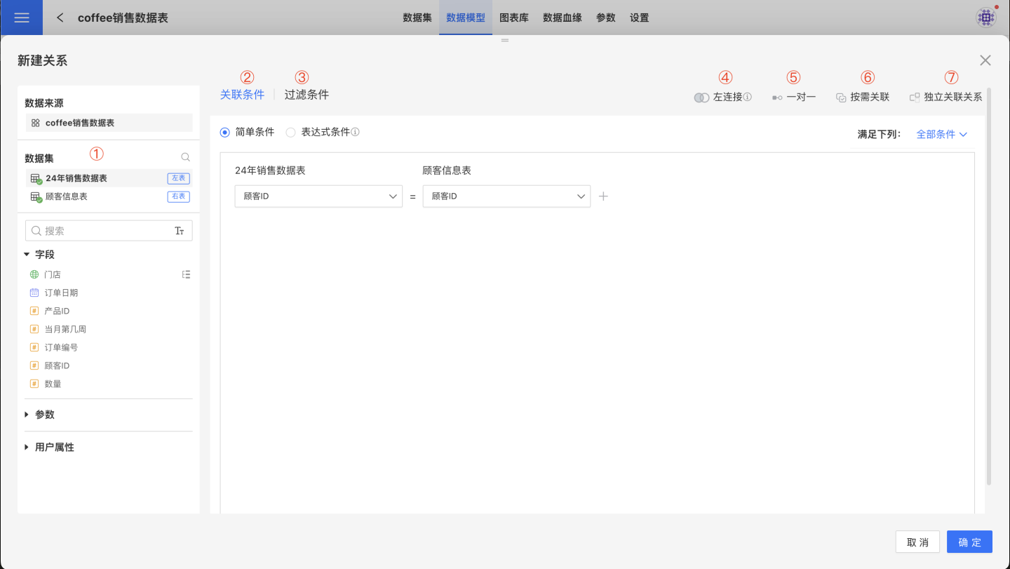 - ① 关系涉及的数据集:它只能涉及到两个数据集,上面的数据集是左表,下面的数据集是右表。