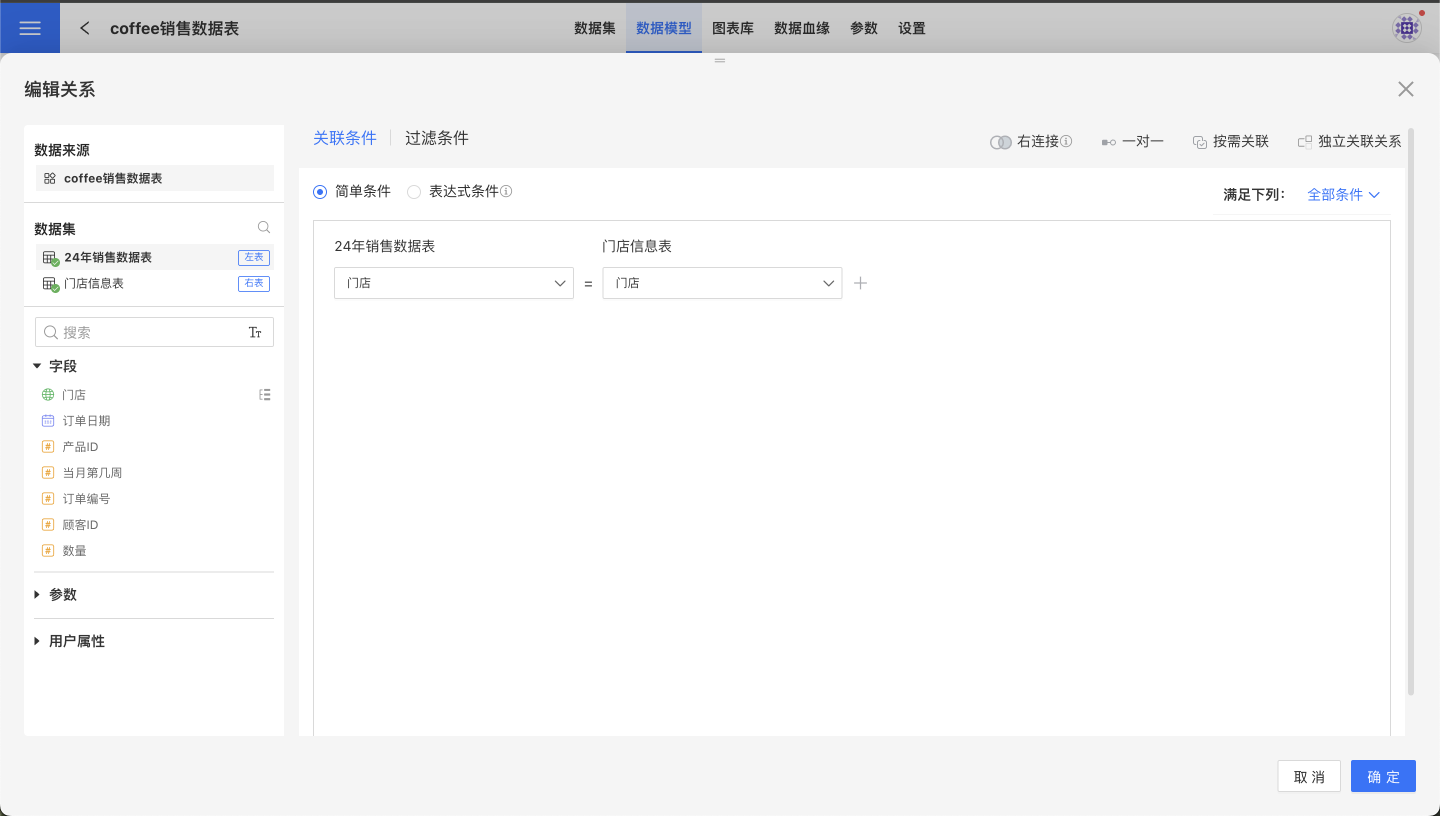 - ② 关联条件:描述两个数据集关联的条件,关联条件可以是简单条件,也可以是表达式条件。