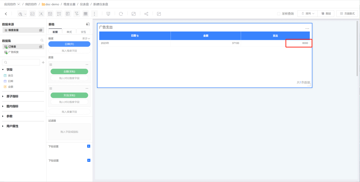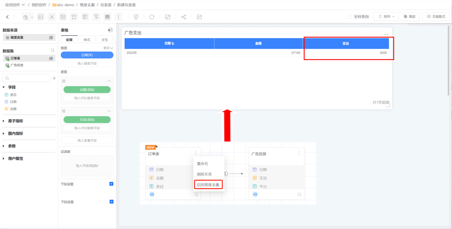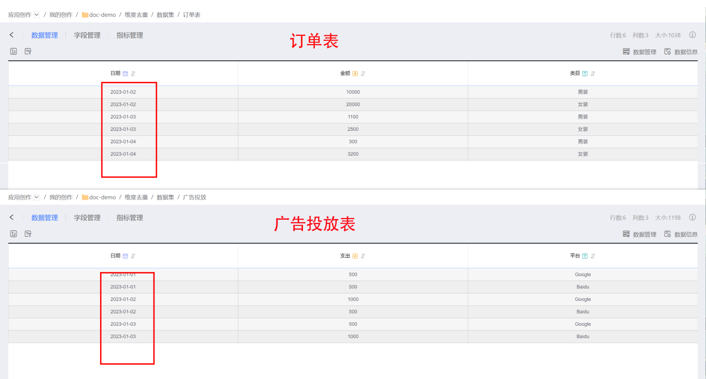下面以订单表和广告投放表两个数据集举例,演示如何使用维度去重功能消除数据膨胀。