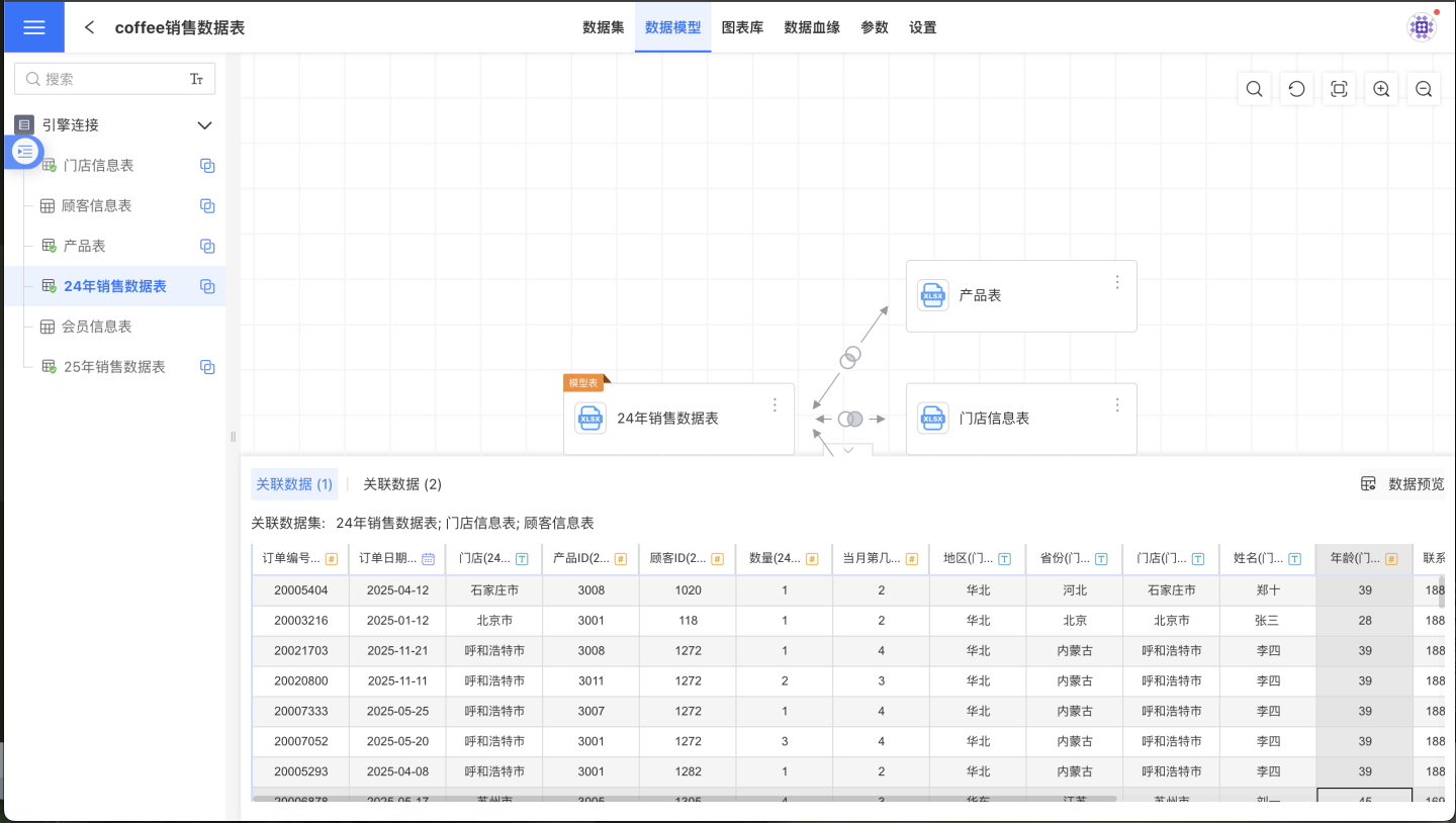 点击数据模型区域右下方的预览数据,可以即时预览关联模型生效后的数据: