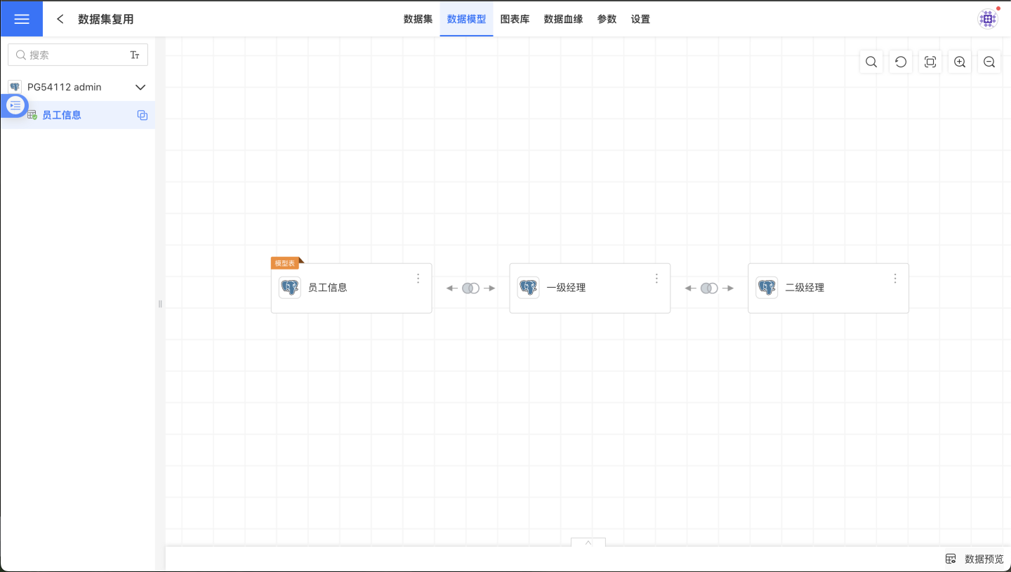 在数据模型页面,选中左侧数据集列表的一个数据集,右侧就展示出了该模型表为中心的数据模型。把左侧列表中的数据集拖到数据模型的节点上,弹出新建关系弹窗,从而定义这个关联关系的属性。