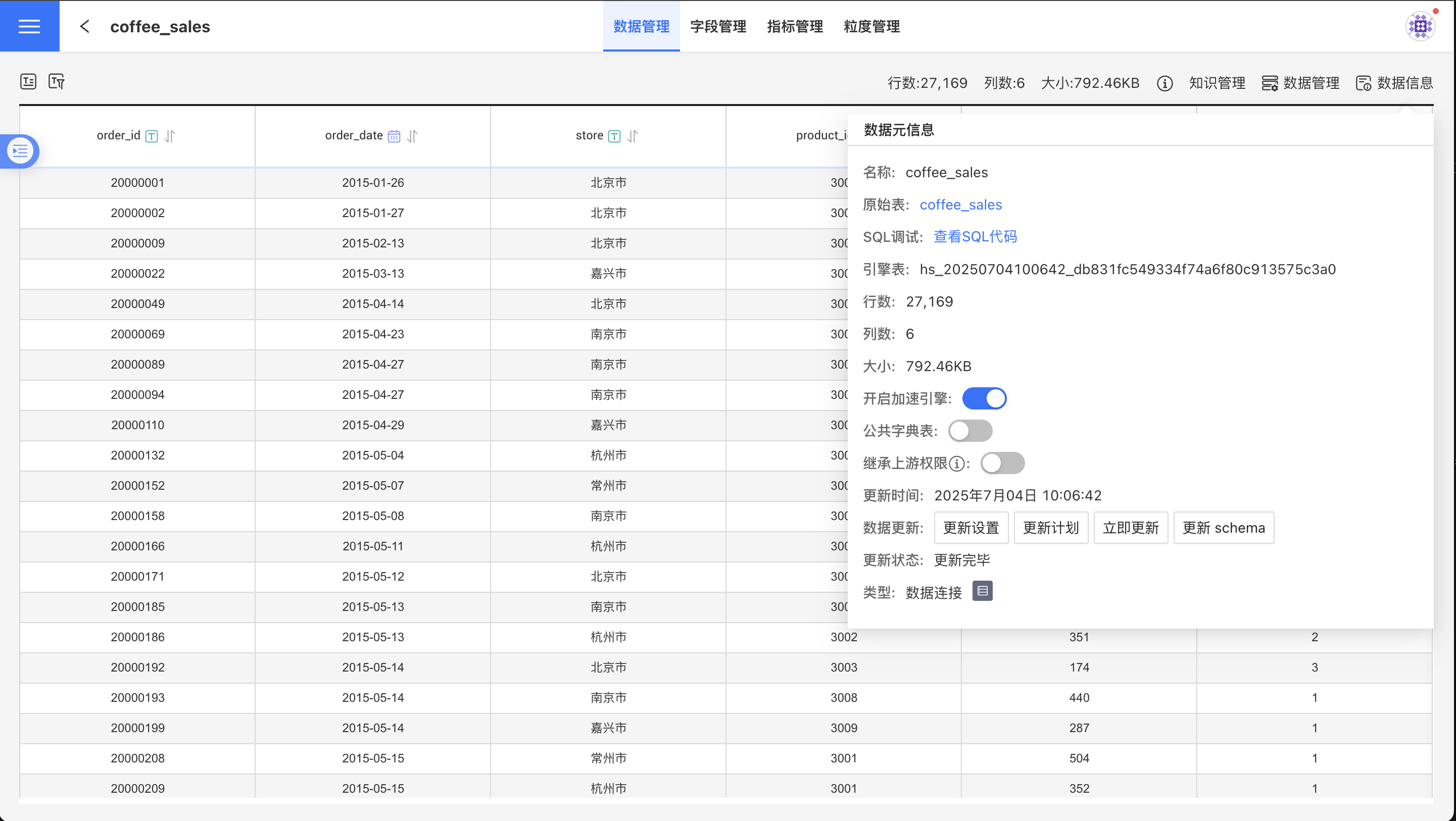 点击数据源信息菜单,弹出数据元信息窗口。打开开启加速引擎,系统会提示“请稍后,数据提取中……”,此时,系统会将数据集提取到引擎中。