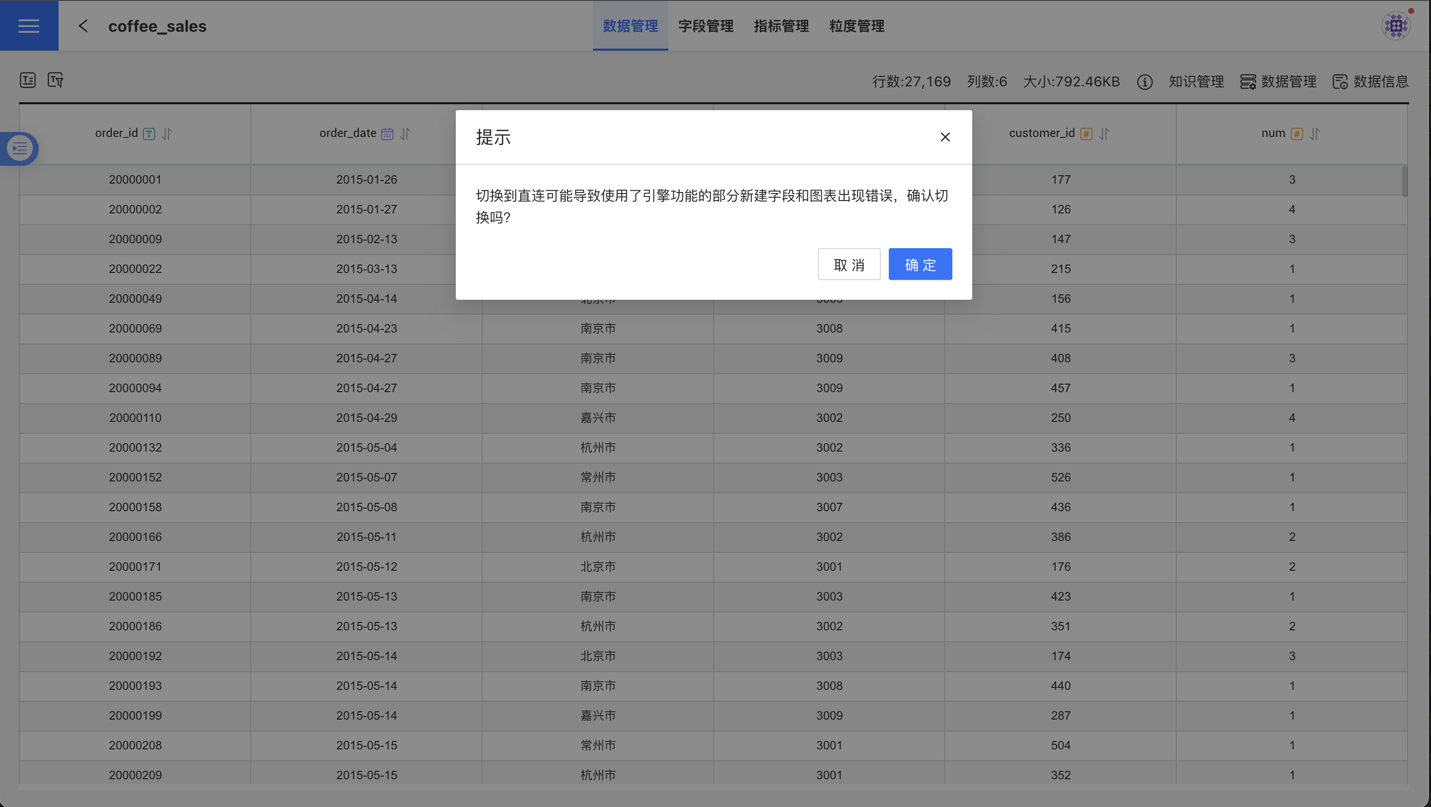 在数据元信息窗口中,关闭开启加速引擎。关闭加速引擎之后,数据集将返回直连原始表模式,此时,如果新字段使用了引擎支持但原始数据库不支持的函数,数据集就会加载失败。如果是新指标使用了引擎支持但原始数据看不支持的函数,则使用该指标的图标会出错。所以系统会弹出确认窗口,如下所示,点击确认可以关闭加速引擎: