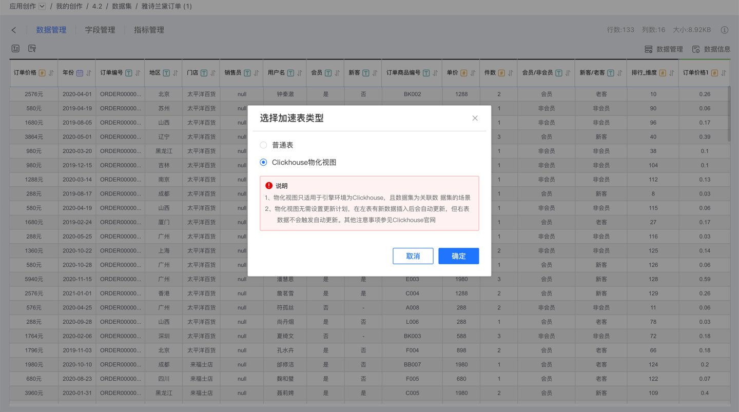 当系统的加速引擎为 Clickhouse 时,多表联合数据集导入引擎时可使用 Clickhouse 物化视图。该物化视图可实时更新数据集,不需要设置更新计划,提升了关联数据的查询性能。